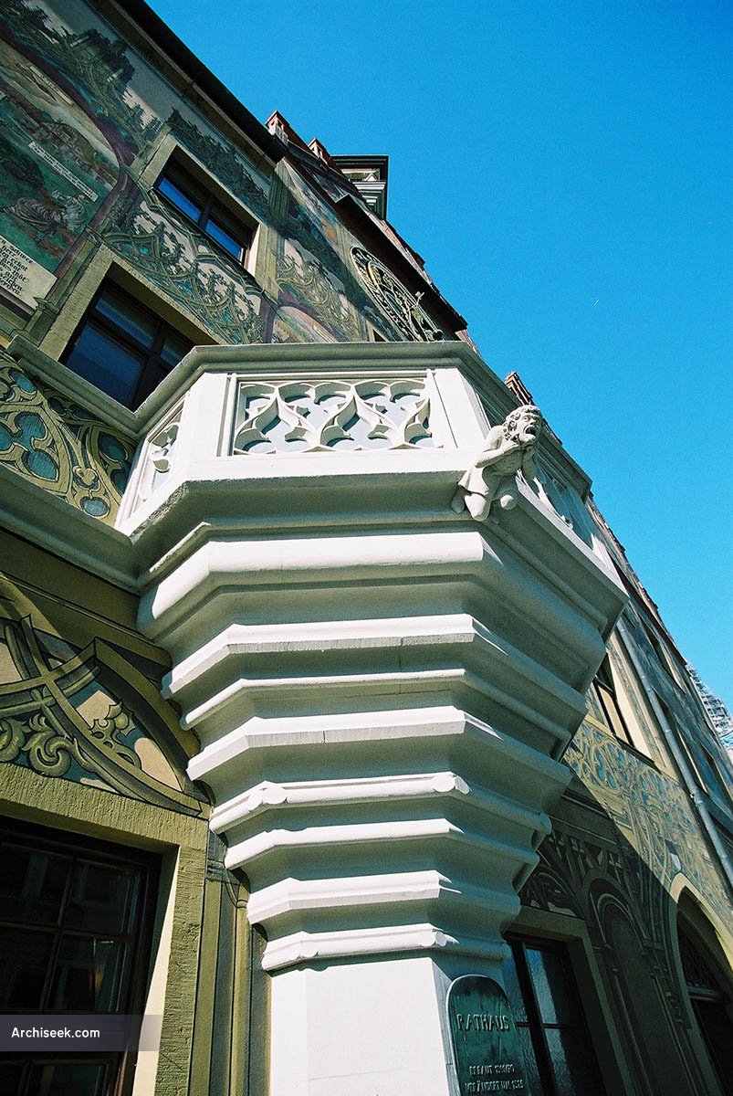 The fine Gothic-Renaissance Ulm Town Hall of 1370 is decorated with brightly coloured frescos. Everything on this building has been decorated or is there for decorative effect from the figurative gargoyles, window surrounds, doorways to the fragile looking gables. Like many of the buildings of Kempten and other nearby towns, a lot of the architectural detail is painted on – painted window surrounds and painted “carved details” abound.