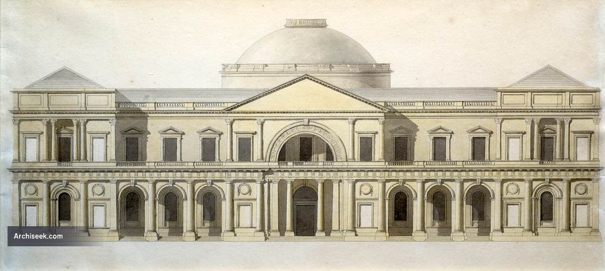 Third placed entry in competition to design a Royal Exchange for Dublin. Some sources including Wright’s “An Historical Guide to Ancient and Modern Dublin” (1821) suggest he was placed second with a premium of 60 Guineas, with James Gandon third. However with Gandon’s obituary stating that Gandon was second, it’s commonly accepted that to be correct. The competition was won by Thomas Cooley, and his building became City Hall.