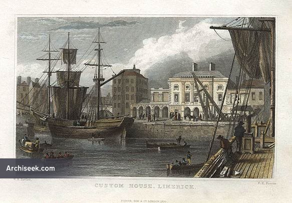 Work started on site in 1765, and the building was completed in 1769. The building is strongly Palladian in character and regarded as the most distinguished 18th century building in Limerick. The façade shown is the landside of the building and plainer in finish than the riverside with its fluted philasters and arcaded ground floor. The Custom House is home to The Hunt Museum.
