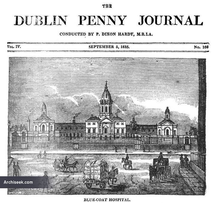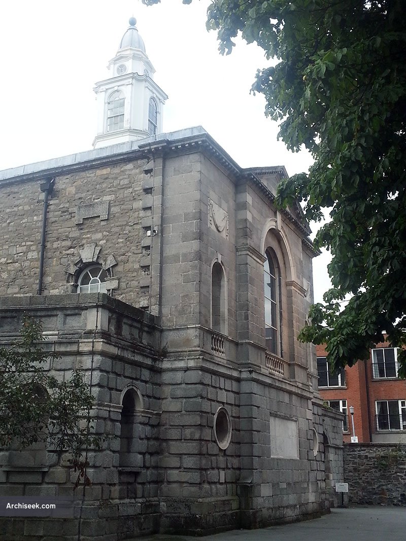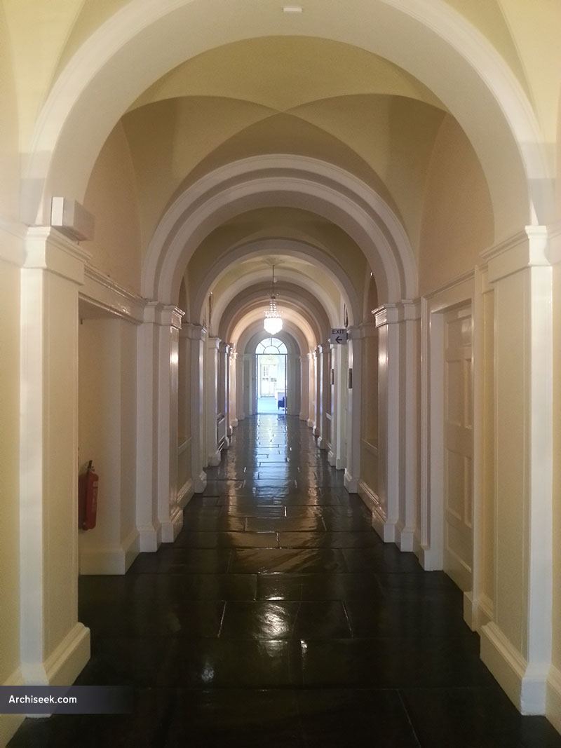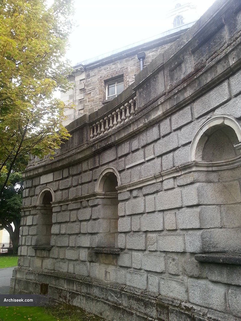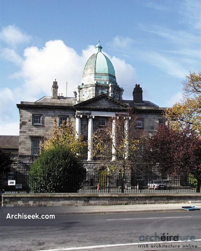 One of Dublin’s great unfinished buildings, the former Blue Coat School, now the Law Society, is a curious building minus the tall and flamboyant spire that was intended. The building was started in 1773 but was never fully completed. Due to a lack of funds, the intended spire was never built, and in the late 19th Century, the remains were removed and a small dome placed over the tower. Unfortunately, the original large brick houses of Blackhall Street have been removed and replaced with corporation housing, destroying the intended vista.