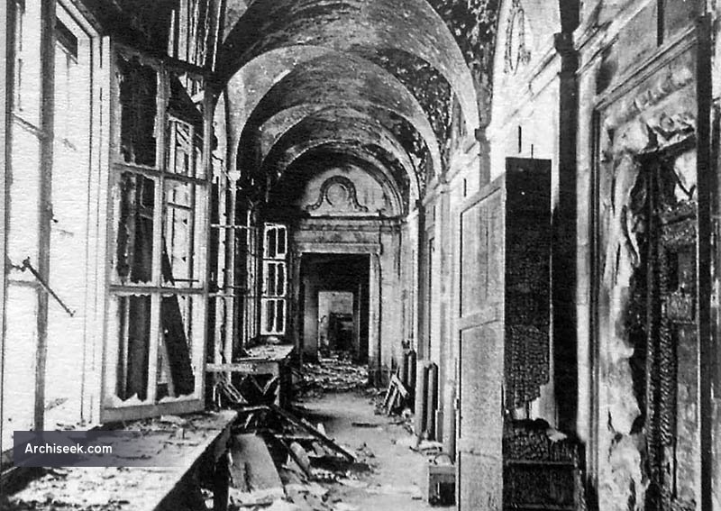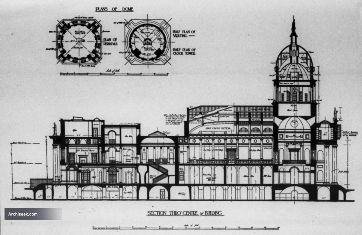 The building underwent serious reconstruction and the dome and drum were completely rebuilt in Ardbraccan limestone as opposed to the original Portland stone. The limestone is a much darker colour and this can be seen in the illustrations. The building was further restored by the Office of Public Works in the 1980s after it was discovered that the large cornice was in danger of collapsing from the damage caused by the fire and the rusting of the ironwork braces holding the stonework together. The fine sculptures and coats-of-arms that adorn the building were restored and a new Portland Stone cornice fitted to replace the sub standard one fitted after the fire.