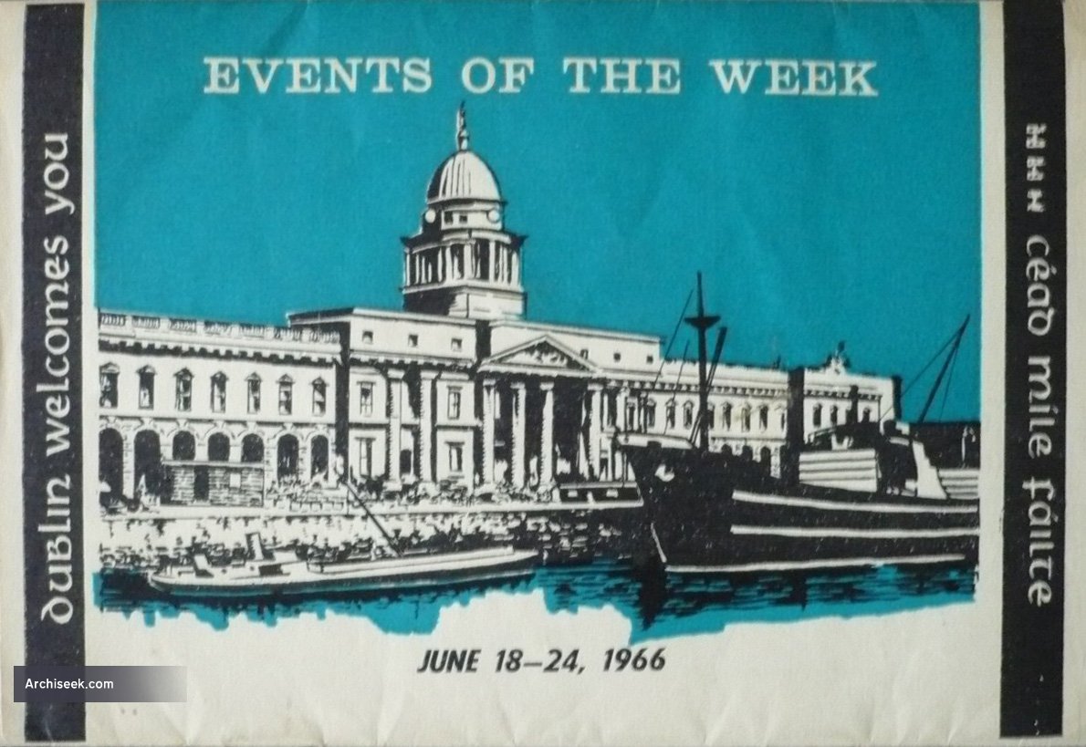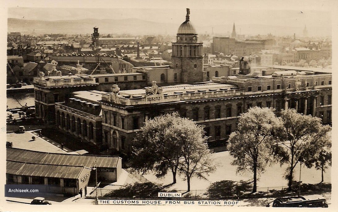 Described by Lewis in 1837, “The Custom-house is a stately structure of the Doric order, situated on the north bank of the Liffey, below Carlisle bridge. It was erected under the superintendence of Mr. Gandon, in 1794, at an expense of £397,232. 4. 11., which the requisite furniture and subsequent enlargements have increased to upwards of half a million sterling. The building is 375 feet in length and 205 feet in depth, and has four fronts, of which the south is entirely of Portland stone, and the others of mountain granite.
