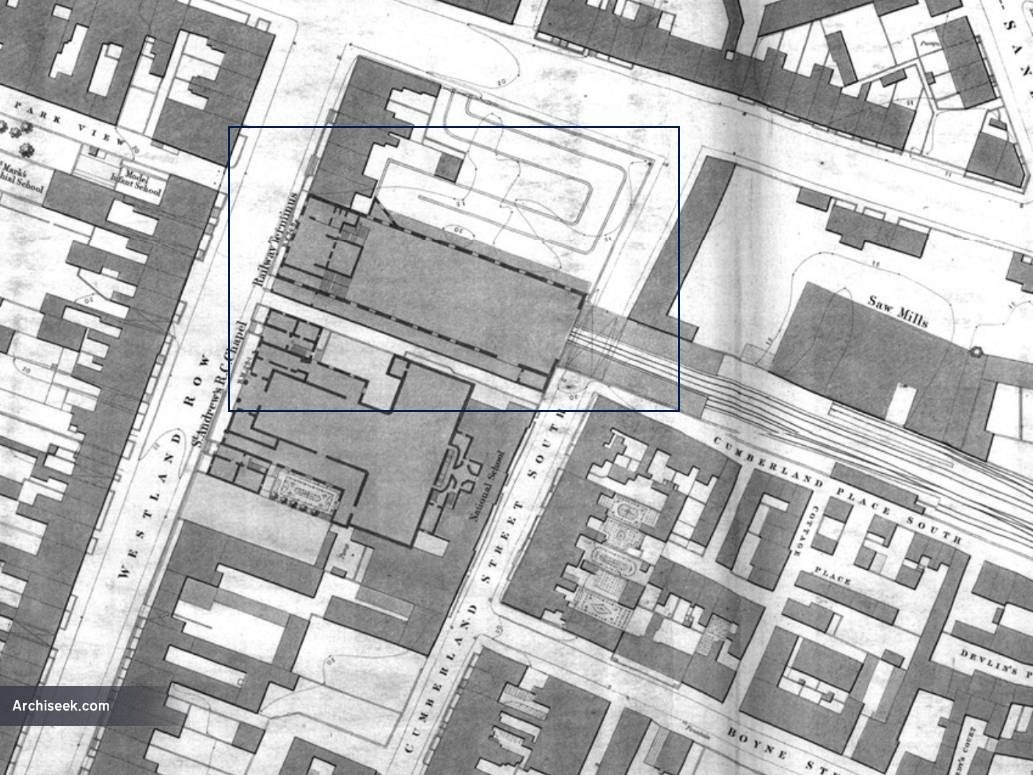 Westland Row Station opened on 17 December 1834 as the city terminus of the Dublin & Kingstown Railway, and the first ‘commuter’ line in the world. The front and offices were designed by William Dargan for £1,100, with the roof structure behind designed by John Bradley & Co., Engineers, of Stourbridge, Wiltshire. Extensively rebuilt for the opening of the City of Dublin Junction Railway, or Loop Line, in 1891. During this process, the station was converted into a through station, although it retained three terminus platforms.