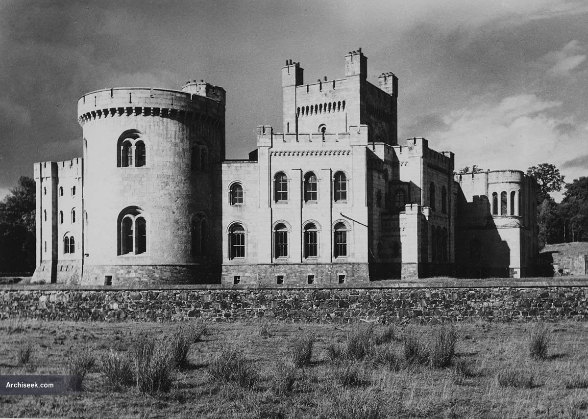 The interior he thought to be “cramped and oppressive … only the dining room, with engaged pilasters of pink Armagh marble and white plaster decoration, is effective and pleasing.” He further noted that it was “reputed to be the largest pile in Ireland”, having some 150 rooms. Thomas Hopper also designed Penrhyn Castle in Wales, which is in a similar style.