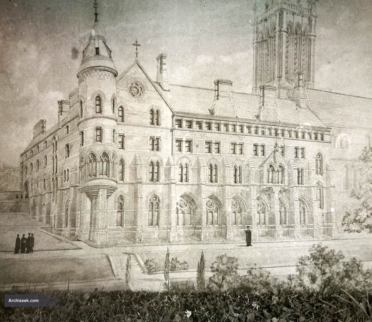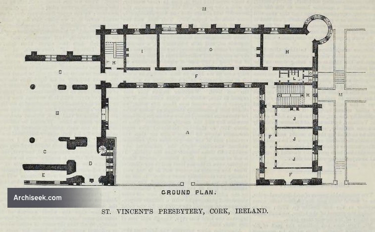 Originally designed by its architect George Goldie as a retreat house, it was built in 1873 as a physical attachment to the west side of St Vincent’s Church. Wood engraved print published in The Builder, 1866. Following extensive refurbishment, the monastery became the home of the Department of Music, UCC, in May 2000. Although the presbytery was largely built as designed, the tower was sadly never constructed.