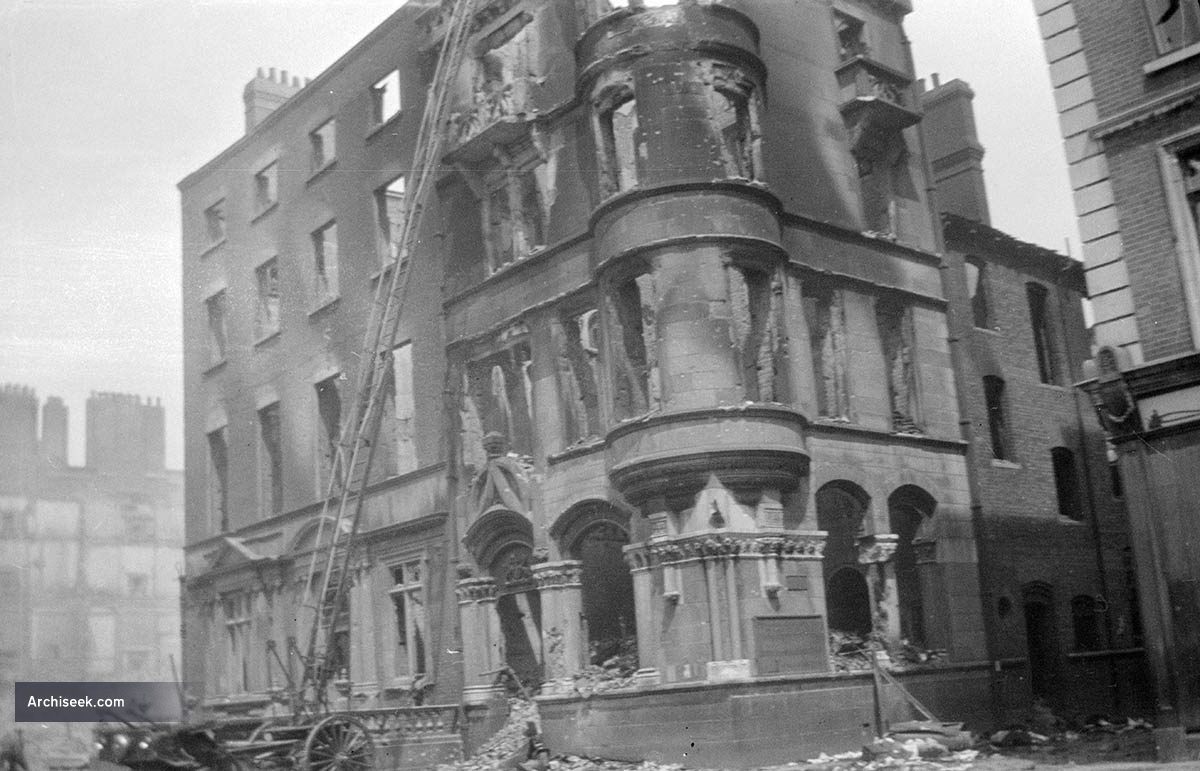 Constructed on the site of Drogheda House, the house occupied by the Earl of Drogheda. O’Connell Street, previously Sackville Street, was previously Drogheda Mall, named after Henry Moore, Earl of Drogheda, giving rise to a naming pattern in the area. Sited on the corner of Cathedral and O’Connell Streets, and designed in a suitably Scottish Baronial style with stepped gables. Later owned by the Dublin United Tramways Company, before it was pulled down in 1922, after being badly damaged during the Irish Civil War.