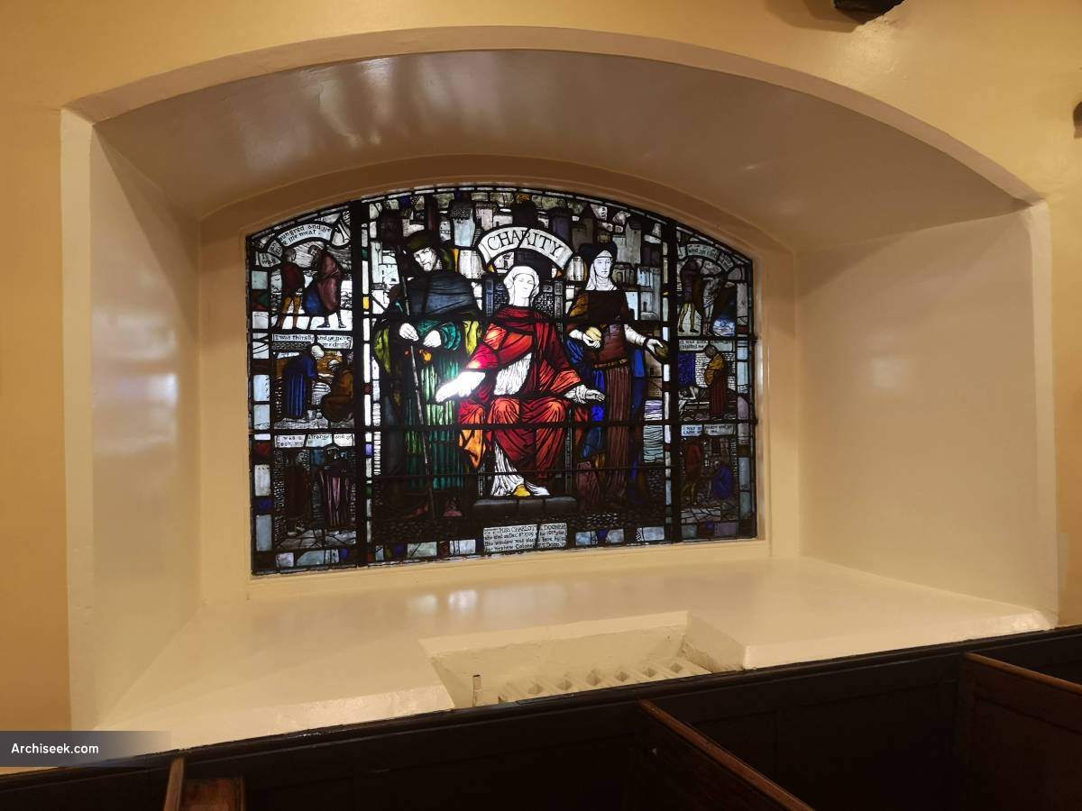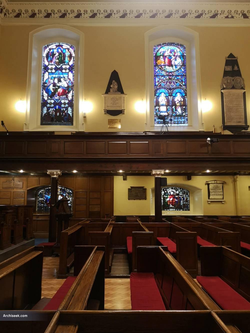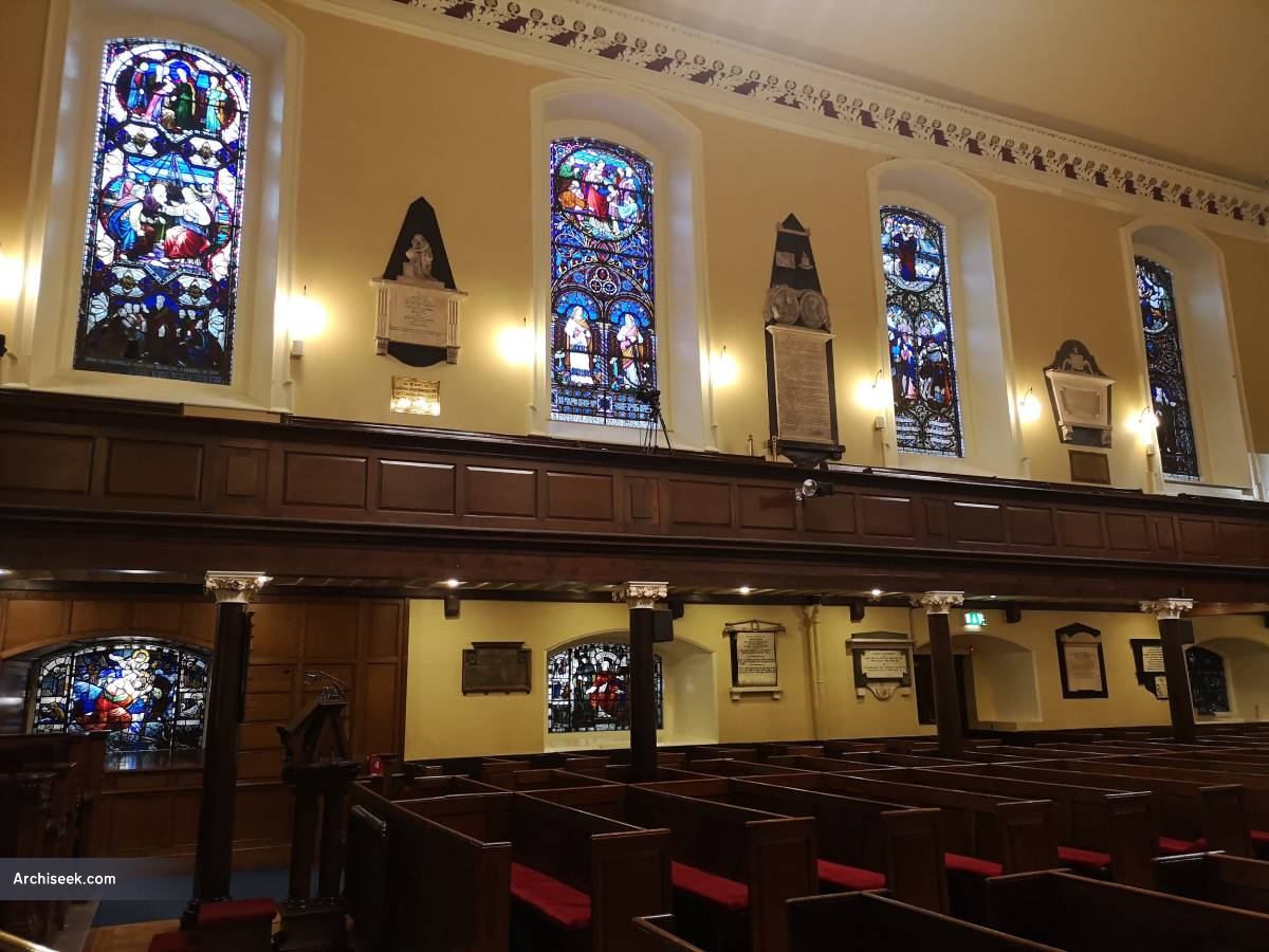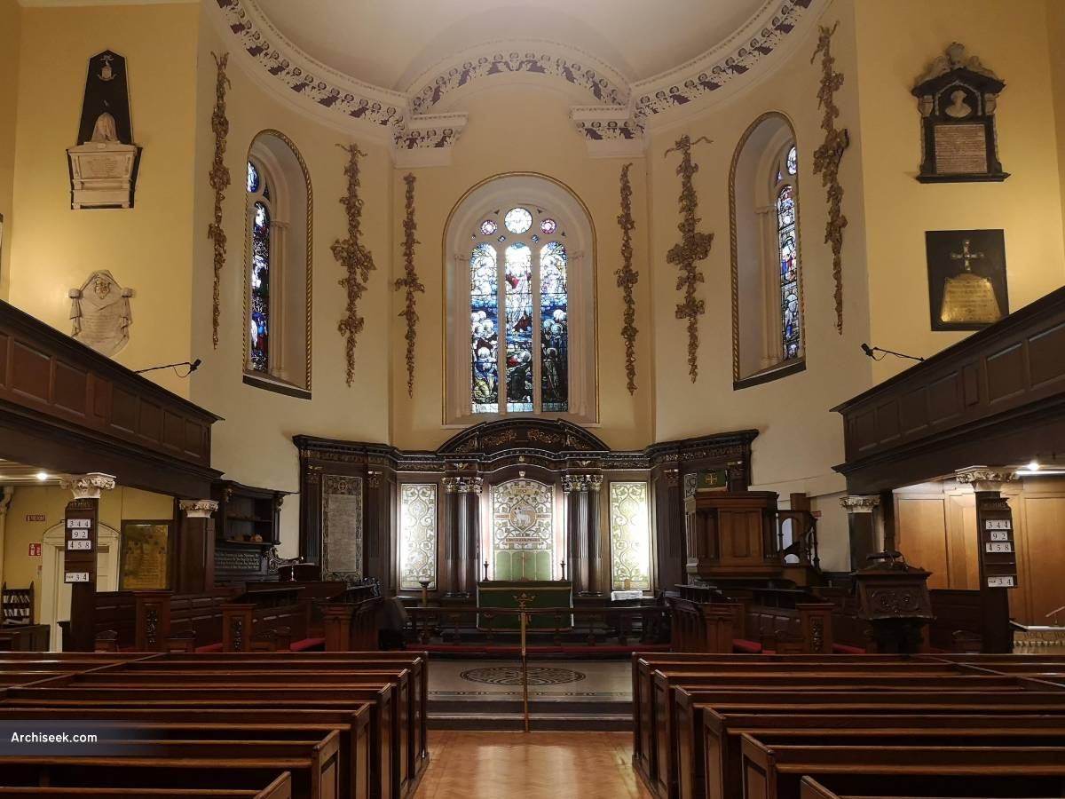 There is a fine galleried interior with box pews and many memorials that reputedly contains more stained glass than any other church in Dublin and includes work by Wilhelmina Geddes, Mayer, Warrington and the O’Connor family. The close proximity of the nearby office block reduces the impact of many of these windows by curtailing the amount of light available.