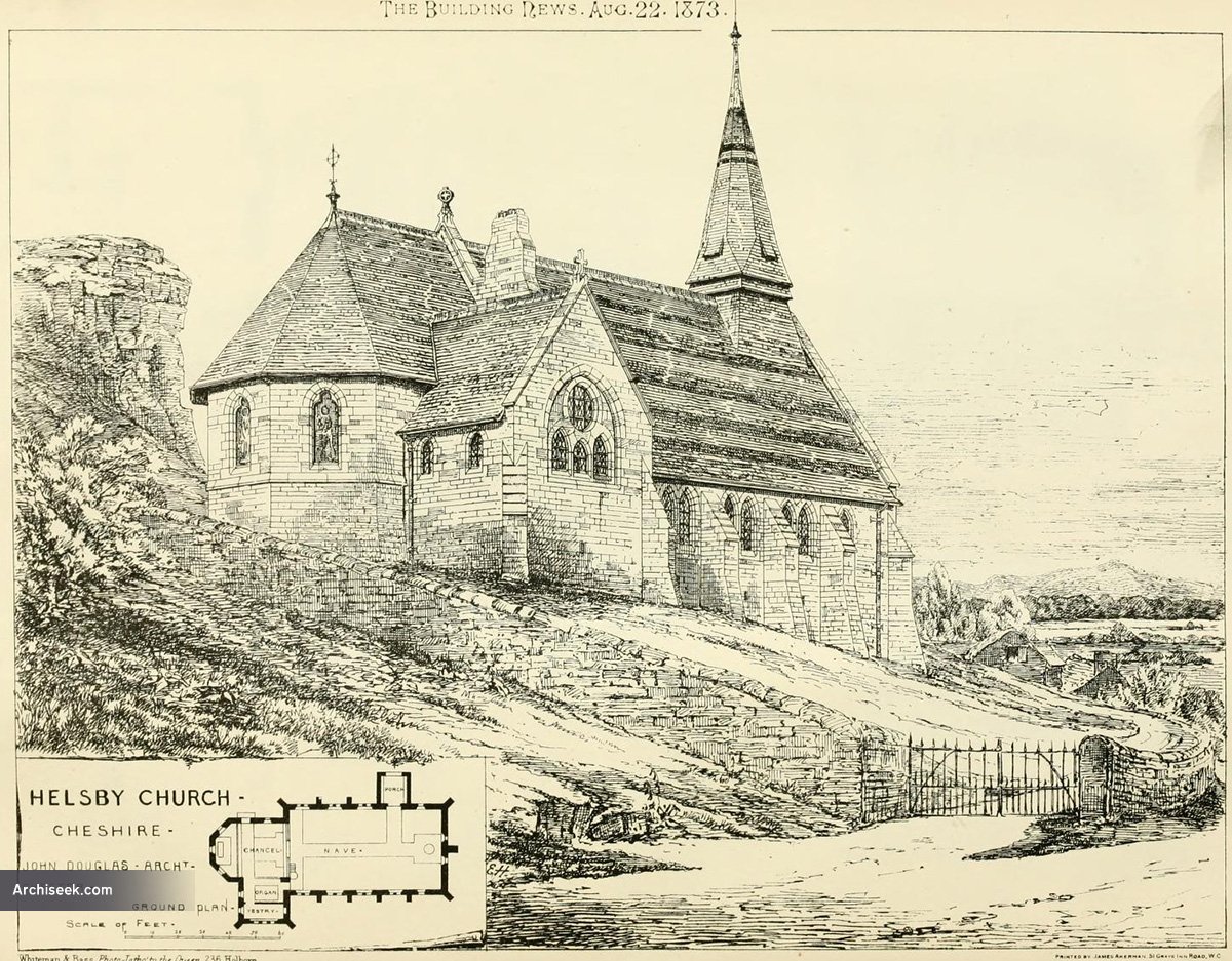 Published in The Building News, August 22 1873: “This church, which has recently been completed on the side of Helsby Hill, as a chapel of ease to the mother church of Frodsham, is built of the local grey sandstone, the roof being covered with Langdale green slates. The chancel windows have painted glass, by Hardman & Co., being the gift of the Vicar of the parish, the Rev. W.C. Cotton. Seating is provided for 300, and the cost has been a little over £2.000, Mr. John Douglas, of Chester, being the architect.”