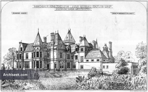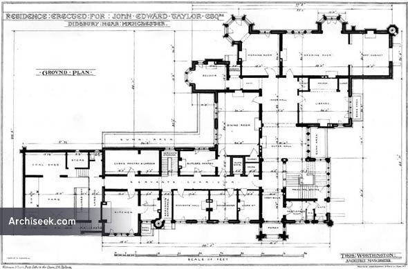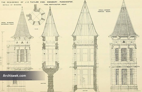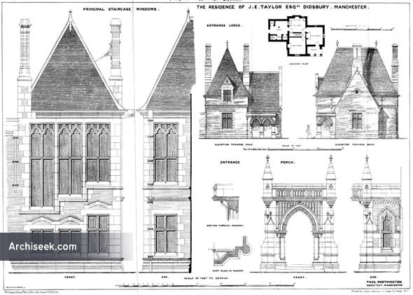 Published in The Building News, August 29 1873: “A MANSION, of which we give illustrations this week, has been recently erected for J.E. Taylor. Esq.. at Didsbury, about five miles to the south of Manchester. It stands on a small estate of some twenty acres, and at a little distance from, though, within sight of, the high road. Externally the materials employed are the light-coloured Darley Dale stone, and bricks of a rich deep red, which form a very happy combination of colour. The workmanship throughout is very excellent, and some portion of the carving, which is by Earp. of London, is admirable. Internally, it consists of a largo block containing the principal rooms, and a wing containing the offices, each division being grouped along a corridor.