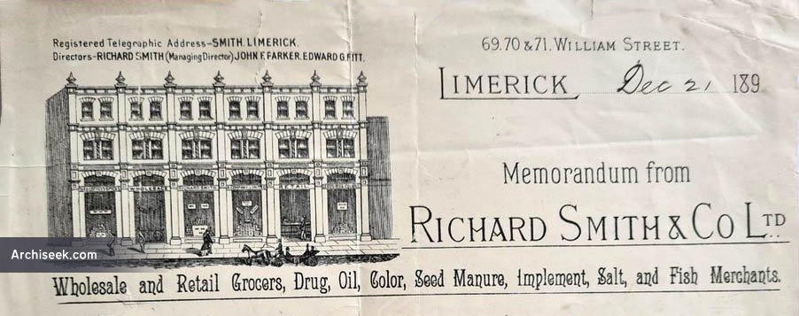 “Extensive premises are in the course of erection in Limerick for the newly formed drapery company of Messrs. Slattery and O’Neill (Limited). The site is at the junction of George-street with Brunswick-street. To the former street there will be a frontage of 75ft and to the latter of 150ft. The building will be about 60ft. in height and will be in the Italian style. The designs are by Mr. William Sidney Cox, C.E. The contractors are Messrs. McCarthy and Guerin. Cost about 6,000.” Published in The Irish Builder, October 15 1873.