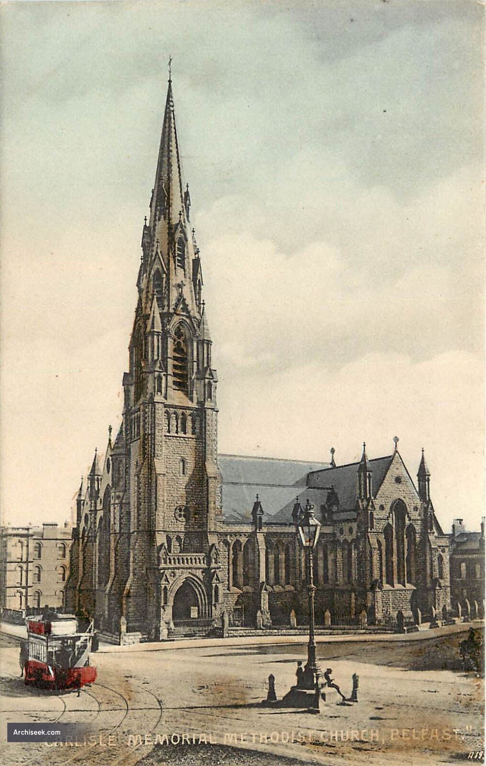 “A memorial church, the gift of Alderman James Carlisle, J. P., to the body to which he belongs in memory of his deceased son, is being erected at Carlisle Circus. The stone employed in its construction is Armagh limestone, with designs of red Dumfries stone. The style is Gothic. The principal entrance, which is embellished with elaborate mouldings, carvings, and capitals, opens from Carlisle Circus. On either side of this door are two niches, in which are to tie placed statues of the Evangelists. A spire and tower will rise over the principal entrance, in height from ground to top about 170 ft., and the spire will be adorned with 16 ornamental windows. The west window of the church will be particularly spacious and handsome, being 30 ft. in height and 17 ft 3 in. in width. There will be no gallery on the church, the ground floor being arranged to seal about 1,000 persons. The entire cost, the whole of which is borne by Mr. Carlisle, will be between £15,000 and £20,000. It is expected that the building will he completed in eight or ten months. Mr. Henry is the contractor, from designs by Mr. W. H. Lynn.” The Irish Builder, December 15 1874.