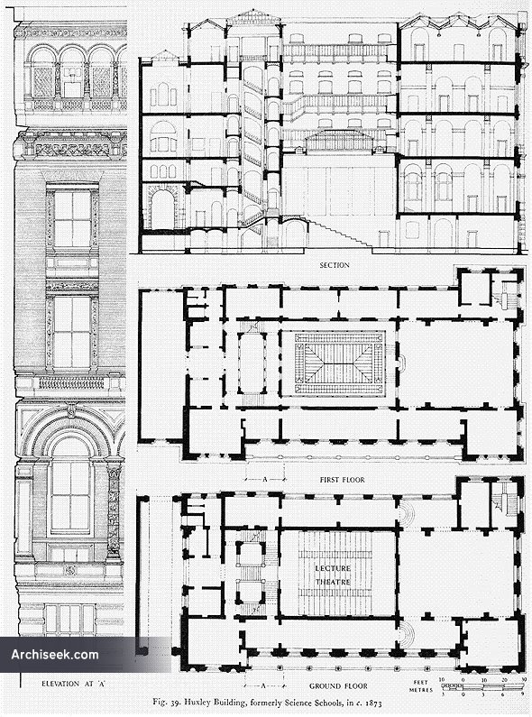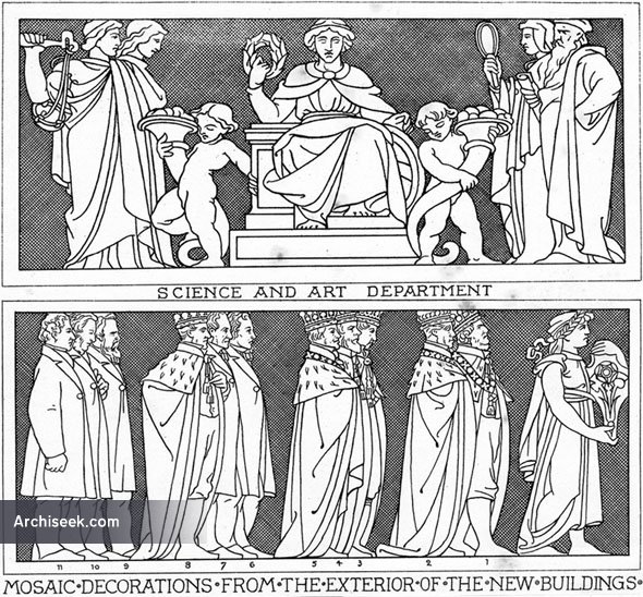 This building was the result of a successful campaign for the establishment of a School of Naval Architecture. The school was transferred to Greenwich in 1873, almost as soon as it had begun to use the new premises, and before the interior was entirely finished; and the building was occupied by a variety of scientific departments. Now known as the Henry Cole wing of the V&A.