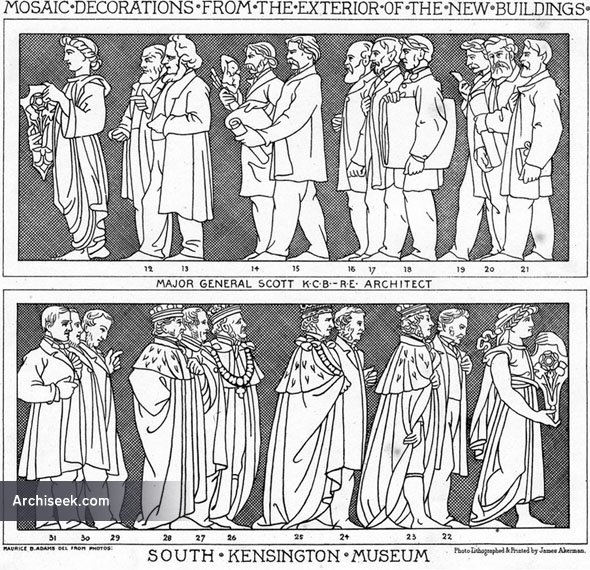 Designed for the Science & Art Department, elevation, and details published in The Building News, March 10th 1876. As Director of New Buildings at the South Kensington Museum complex, Scott delegated work, more often than his predecessor Francis Fowke. On more than one occasion the general forgot which of his staff ‘did the Architecture’ of an important museum building, where there was an atelier system in operation until at least the mind 1870s. It is now accepted that Scott completed the building with the assistance of James Gamble (exterior decoration) and J.W. Wild (interior arrangement). An elaborate decorative scheme was devised, based on Sykes’ decoration of the museum’s Lecture Theatre building. The terracotta columns on the ground floor exterior are identical to those on the Lecture Theatre front. On the top floor of the building are more ornate columns, producing an open arcaded balcony or loggia.