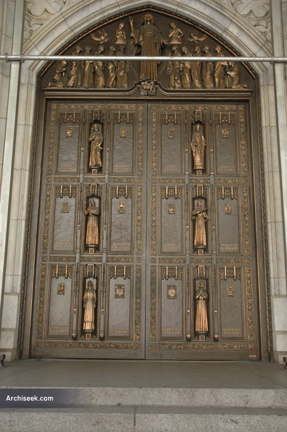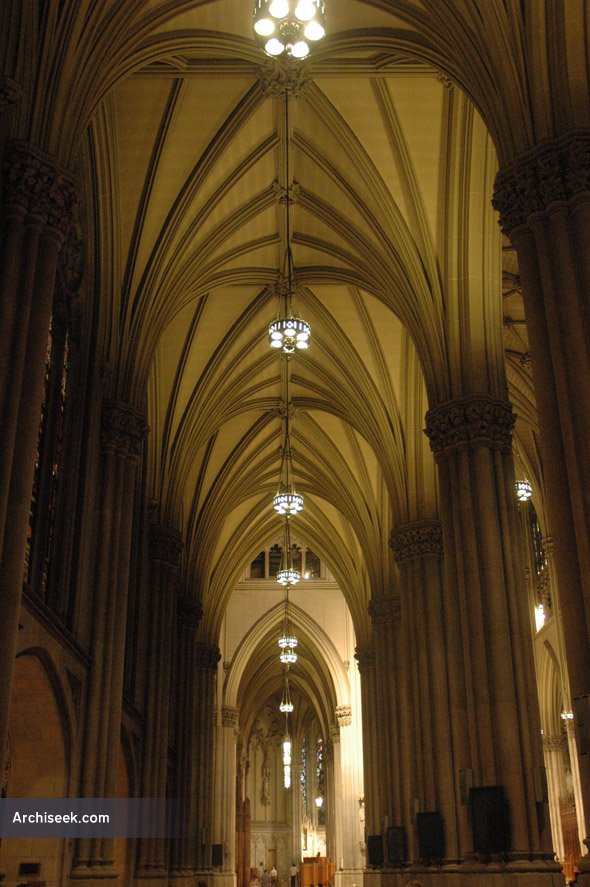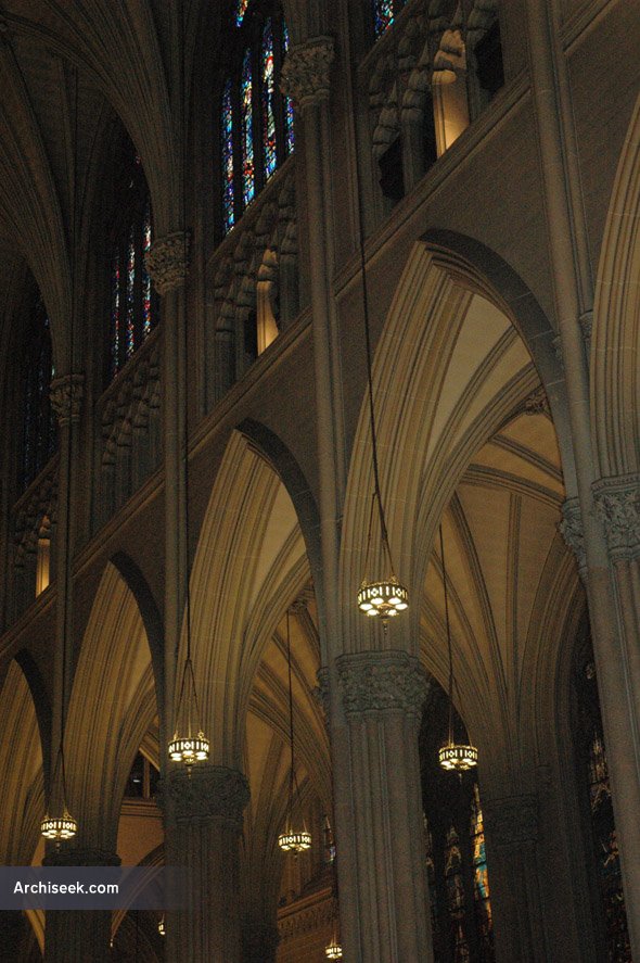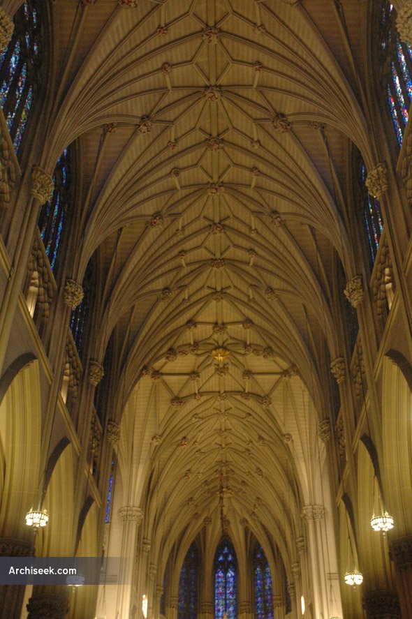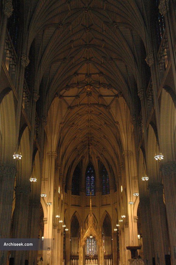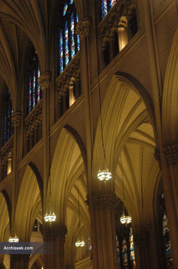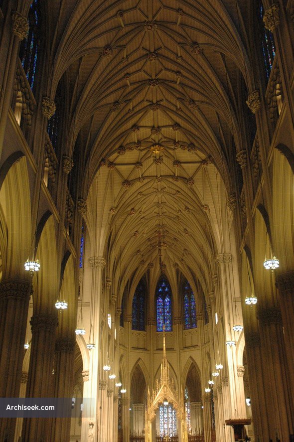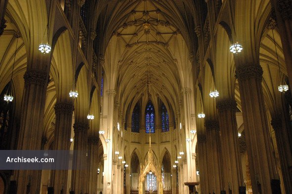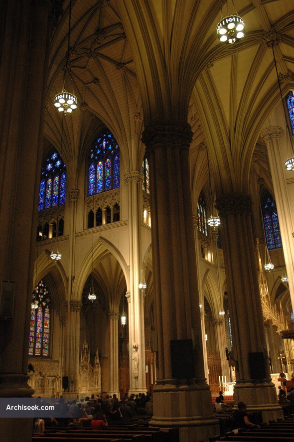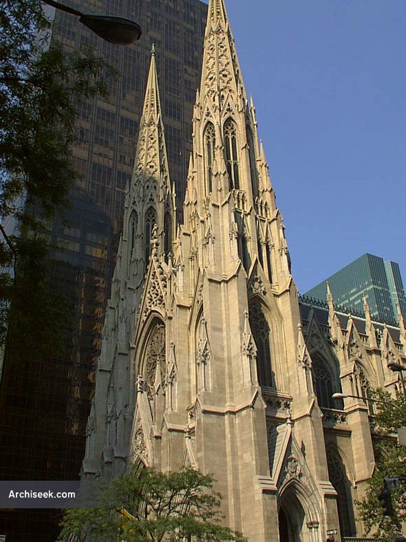 St. Patrick’s Cathedral is the largest decorated gothic Catholic Cathedral in North America. In 1850 Archbishop John Joseph Hughes announced his intention to erect a new cathedral to replace the Old St. Patrick’s. The old cathedral was destroyed by fire in 1866 and was rebuilt and rededicated by 1868. It is still a parish church and is the oldest Catholic site in New York City. Work was begun in 1858, but was halted during the American Civil War, commencing again in 1865. The cathedral was completed in 1878 and was dedicated on May 25, 1879. Towers on the West Front were added in 1888, and an addition on the east, including a Lady Chapel, designed by Charles T. Mathews, began in 1901. The cathedral was renovated between 1927 and 1931, when the great organ was installed, and the sanctuary was enlarged.