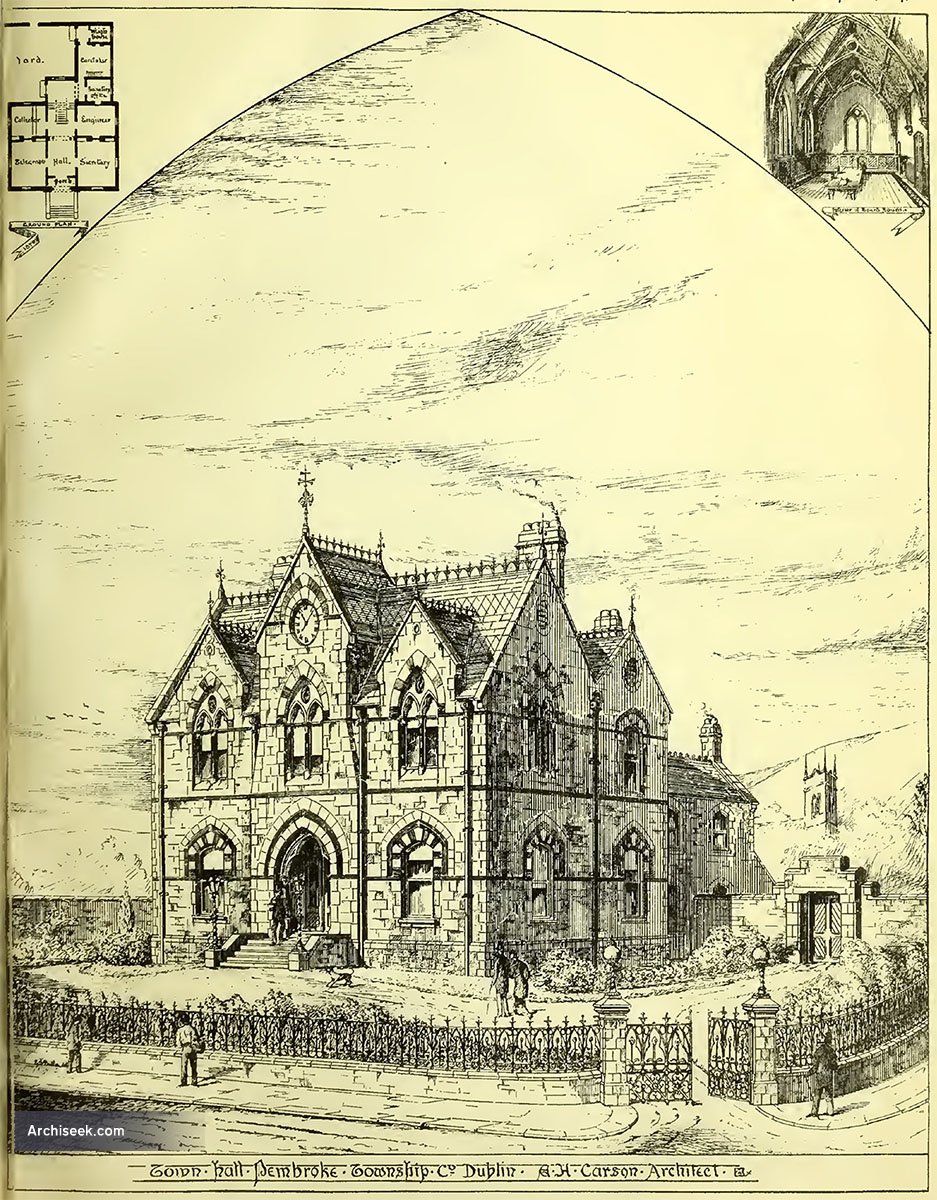 From The Building News: “The new Town Hall for the Pembroke Township, now in course of erection, is situated on the Rock-road, adjoining Ball’s-bridge, on the outskirts of the City of Dublin. It is built of rough-punched Ballynockan granite set in regular courses, with bands of red sandstone. The principal entrance door and windows of upper story have columns of polished Aberdeen granite. The building provides accommodation on the ground floor for secretary, engineer, rate collector, post and telegraph office, also sanitary office and care- taker’s apartments. The board room, 45ft. by 21ft., with open timber roof stained and varnished, is on the first floor. Off same, are waiting and cloak rooms, with lavatories, w.c., &c. Messrs. Gahan and Sons, of Dublin, are the builders, and have taken the contract at £3,300, which does not include the stables and out-offices, nor gas-fitting or wrought-iron safes. Mr. E. H. Carson, of Harcourt-street, Dublin, is the architect. “
