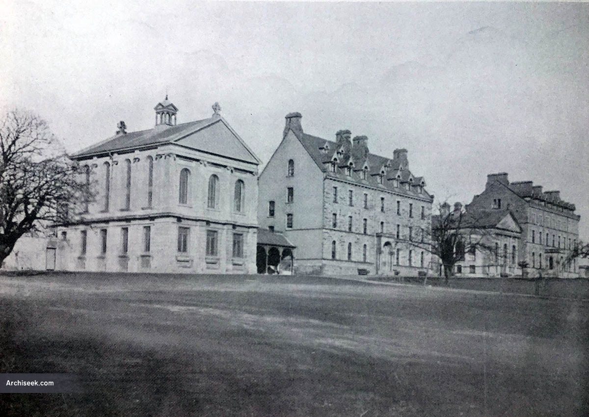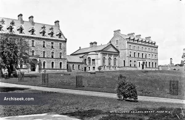 The central building was a casino or recreational building for the Bishop of Derry. The two blocks by Crome & Toye were later added: south wing, 1877-79; north wing, 1892-3. The building between the two major blocks was demolished and replaced with a church by Ralph H. Byrne of W.H. Byrne & Son in 1936-41. The church porojects forwards between the two older buildings.