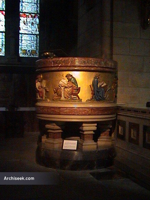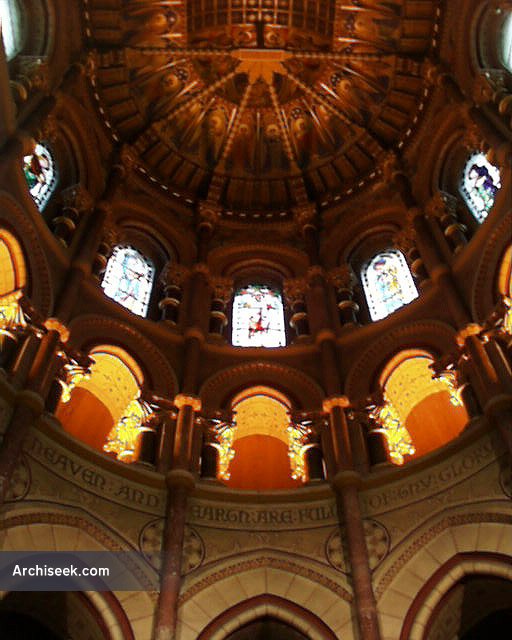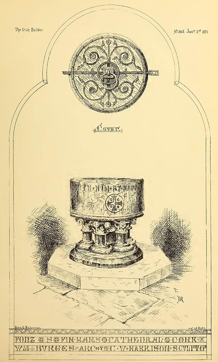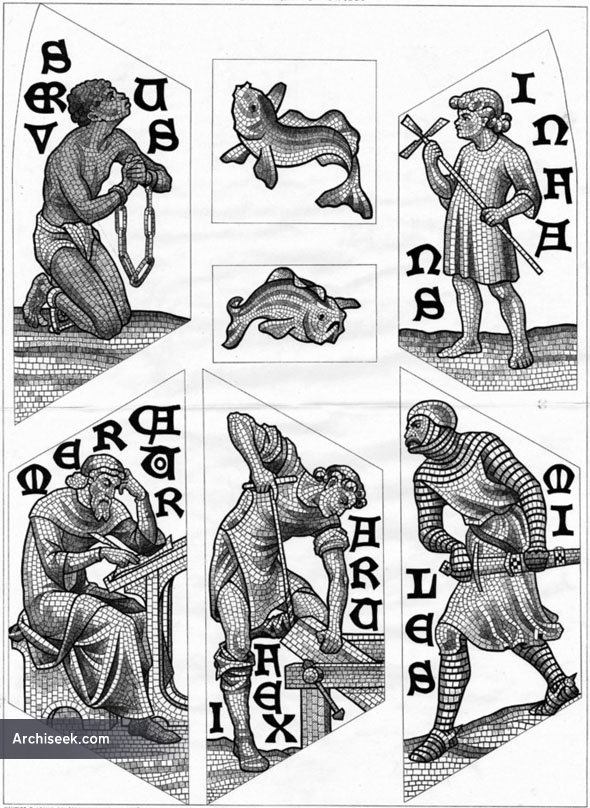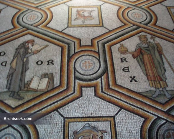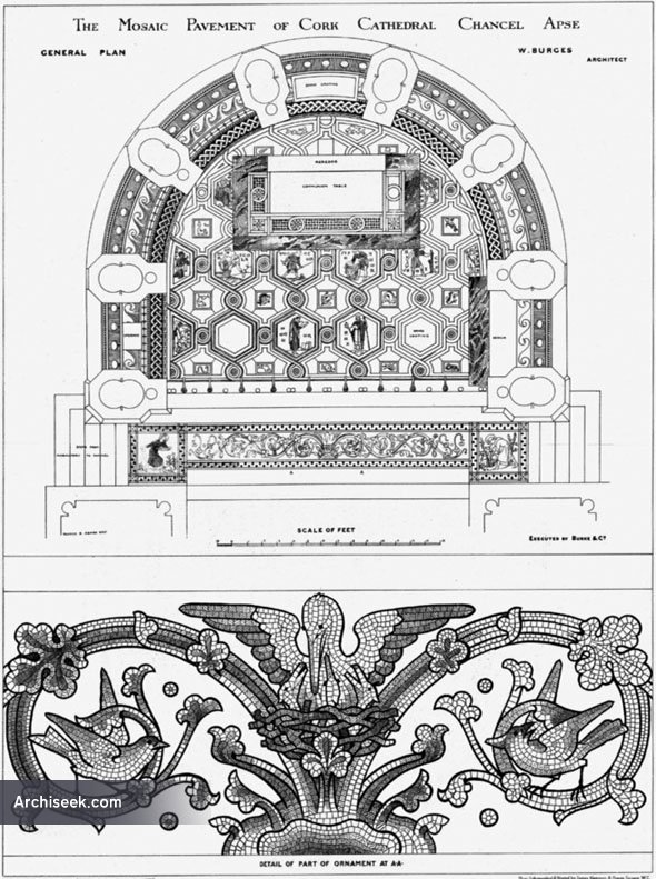 Mosaic details are from The Building News, February 20th 1880. “We regret that we have been unable to give an illustration of the pavement itself of the chancel at Cork Cathedral before the mosaics illustrated this week. The weather, and other causes beyond our control, have prevented the completion of the other drawing, which will, with the permission of Mr. Burges, be given .shortly. The artist of the designs now given was Mr. H.W. Lonsdale ; and the mosaics were executed by Messrs. W. H. Burke and Co., of Newman-street, Oxford- street, for the architect of the cathedral, Mr. W. Burges.”