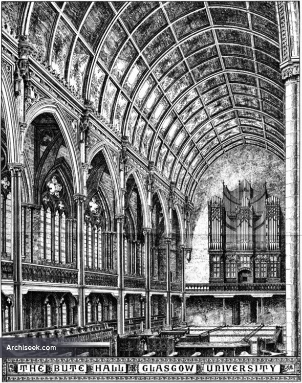 In 1870 a new-build campus was designed by Sir George Gilbert Scott in the Gothic revival style for Glasgow University replacing their traditional location. The largest of these buildings echoed, on a far grander scale, the original High Street campus’s twin-quadrangle layout. Between the two quadrangles Scott’s son, Oldrid, built an open undercroft, above which is his grand Bute Hall (used for examinations and graduation ceremonies), and the buildings’ signature gothic bell tower. The blond sandstone cladding and Gothic design of the building’s exterior belie the modernity of its Victorian construction; Scott’s building is structured upon what was then a cutting-edge riveted iron frame construction, supporting a lightweight wooden-beam roof.
