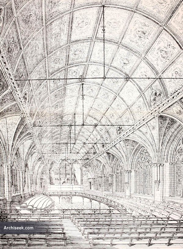 “One of our double -page plates illustrates the interior of the Great Hall of the Glasgow University, of which the late Sir Geo. Gilbert Scott, R.A., was the architect. The view shows the original idea of seating, but in execution this has been modified, and so has the groining on the right-hand side of the picture, a light arcade with detached shafts being introduced in a line with the front of the gallery. The windows remain as here shown. We have received no further particulars, but as we shall illustrate the exterior of this building in a week or two, with a plan of the entire University, we hope then to be able to give some account of the structure, and of those who have built it. “