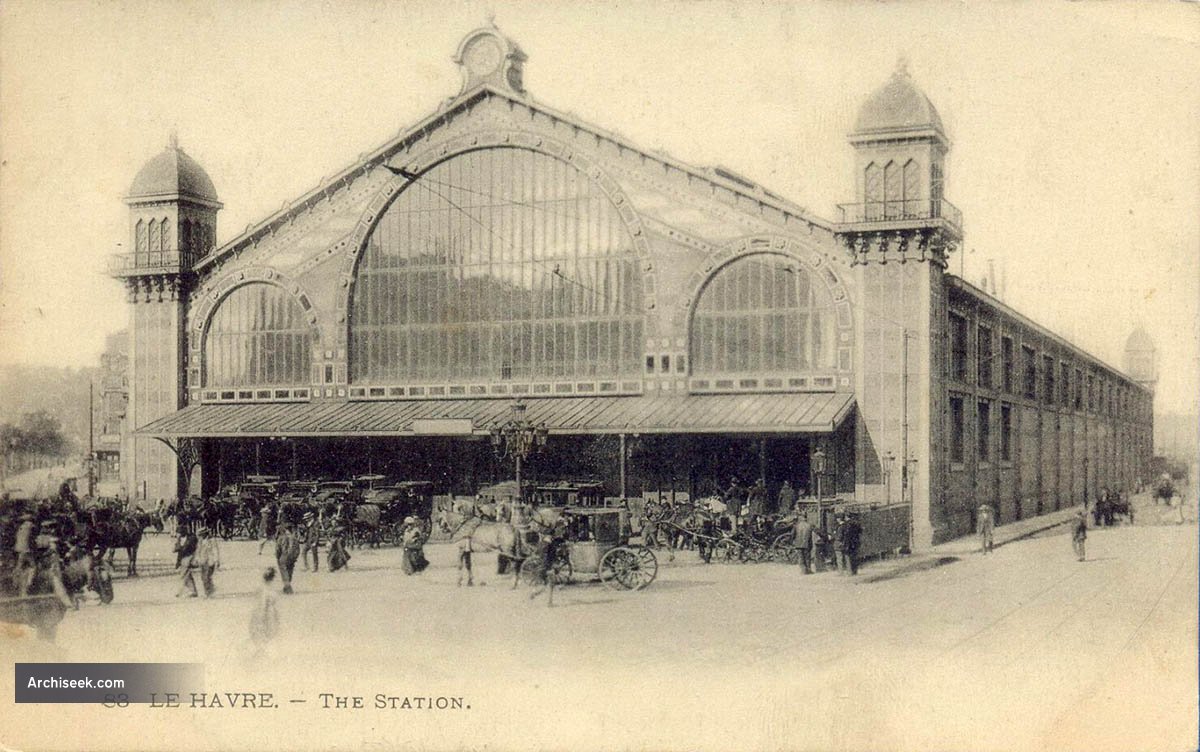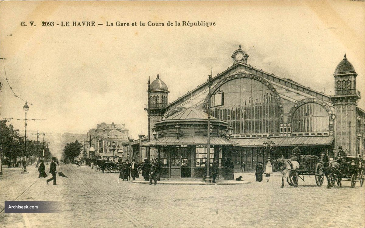 The second railway station in Le Havre, built in 1880 to replace the original station of 1847. The architect studied at the Ecole des Beaux-Arts and was pupil of Léon Vaudoyer and Henri Labrouste. His architectural career was geared towards civic work: stations, public buildings, churches, and restoration of monuments. Replaced with a new station built in 1932 by Henri Pacon for the CF de l’Etat replacing the older building along with a new clock tower.