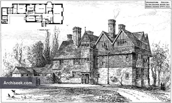Perspective view & ground plan published in The Building News, July 2nd 1880. Designed for Sir George Baker.”Woodhouse, for Sir George Baker, Bart., is now building at Uplume, Devon, near Lyme Regis. It is beautifully placed on rising ground, in one of the loveliest coombes of this part of Devonshire, with a fine view over the Lyme Bay, and is situated near Eonsdon, a large work just completed for Sir Henry Peek by the same architects. The ground-story of the building is of random-coursed stone, built hollow, with brick lining. The upper portion of the building is of timber, boarded and felted over and covered with weather-tiling. The gables are of oak timber work. The contract was taken in competition by Mr. Luscombe, of Exeter, for the sum of £4,525.”