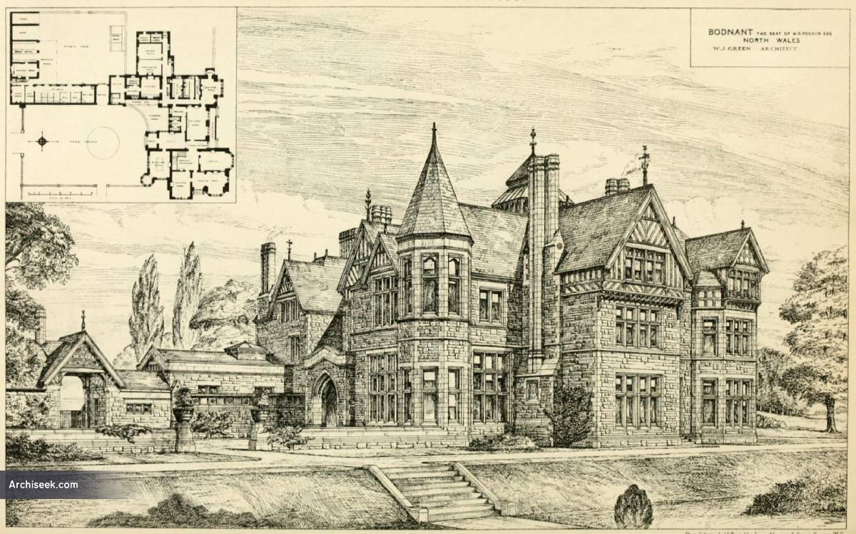 “Tins building, which has been erected for H. D. Pochin, Esq., is situate in a most picturesque part of the Conway Valley, at an elevation of about 200ft. above the river, and commanding, magnificent views of the Snowdon range. It is built on the site of an old house, which, however, possessed nothing of interest, and of which some minor portions have been worked into the interior of the new house. The walls are hollow throughout, and are constructed of a grey Chert stone quarried on the estate, and the whole of the moulded and dressed stonework is executed in Talacre stone. The roofs are covered with Welsh slates, and a certain relief of colour is obtained by the use of the half-timbered work in the upper portion. The surrounding country being very much broken up and richly wooded necessitated considerable play of outline in the general design, and especially in the roofs, to make the building harmonise with its surroundings. The work was executed by Messrs. Lucas Brothers, the architect being Mr. W. J. Green, of 8, Delahay-street, Westminster.” Published in The Building News, July 29 1881.