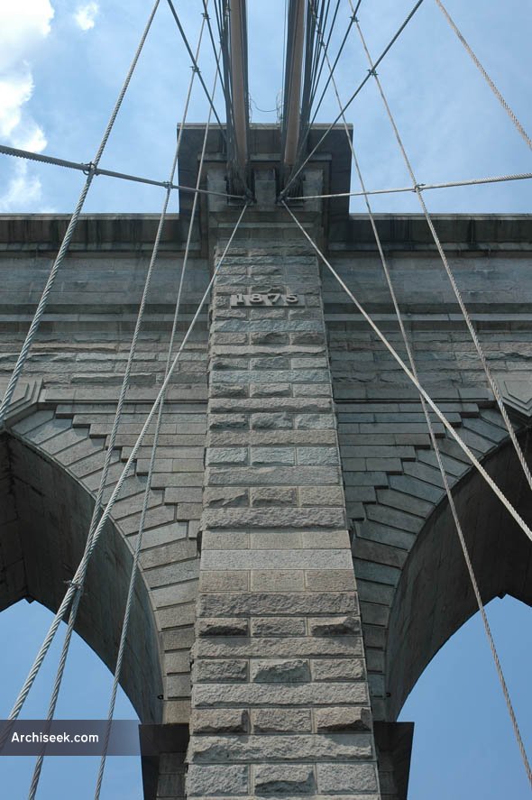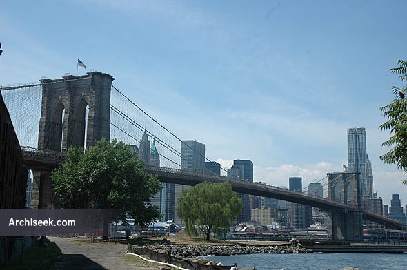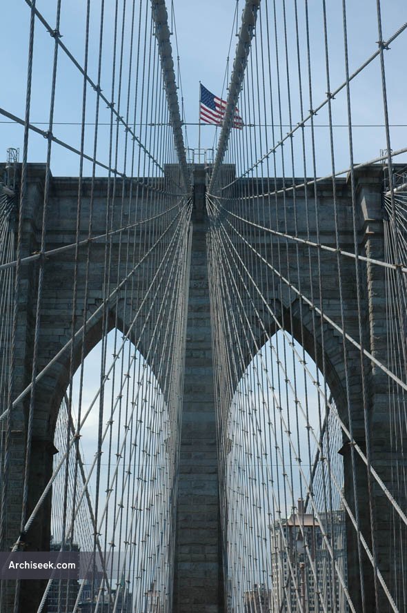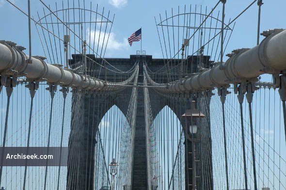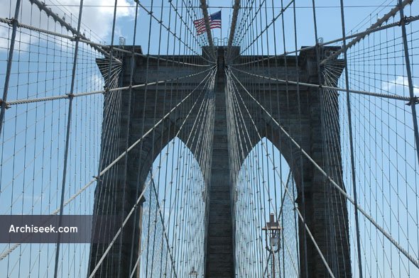 The Brooklyn Bridge (originally the New York and Brooklyn Bridge) is one of the oldest suspension bridges in the United States, and stretches 5,989 feet over the East River connecting the New York City boroughs of Manhattan and Brooklyn. On completion, it was the largest suspension bridge in the world and the first steel-wire suspension bridge. The bridge has an elevated central pedestrian walkway. For several years after completion the towers were the tallest structures in the Western Hemisphere.