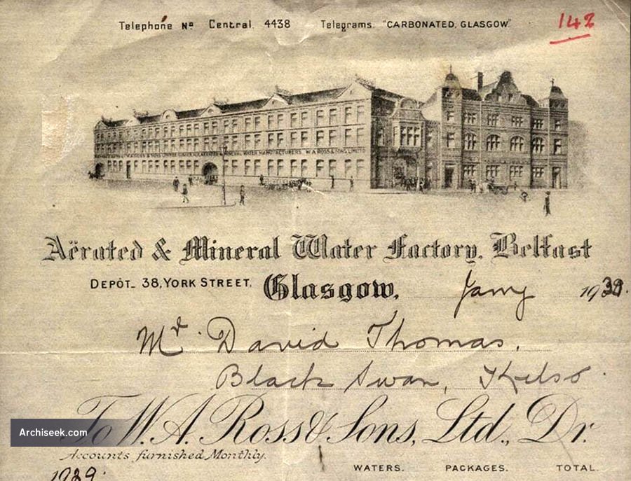 Former Ross’s mineral water factory, Belfast. Using its own artesian well, Ross’s produced mineral waters at William Street South for almost 100 years until the mid 1970’s. The premises lay empty for a long time until extensively renovated as Ross’s Court, a shopping place on the lines of Covent Garden.