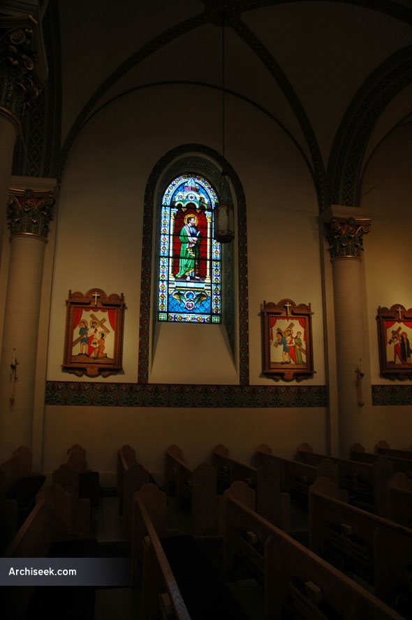 The new stone Cathedral was built around and over the old church, in a curious mixture of French Gothic and Romanesque. Unfortunately it was never completed, the intended twin spires were unfinished due to lack of funds. By 1884 the main part of the Cathedral was finished and the old church was torn down from under it. The stained glass windows were created in France, traveling to Santa Fe via ship and then overland on a covered wagon.
