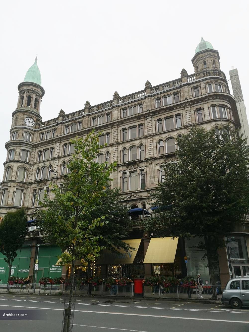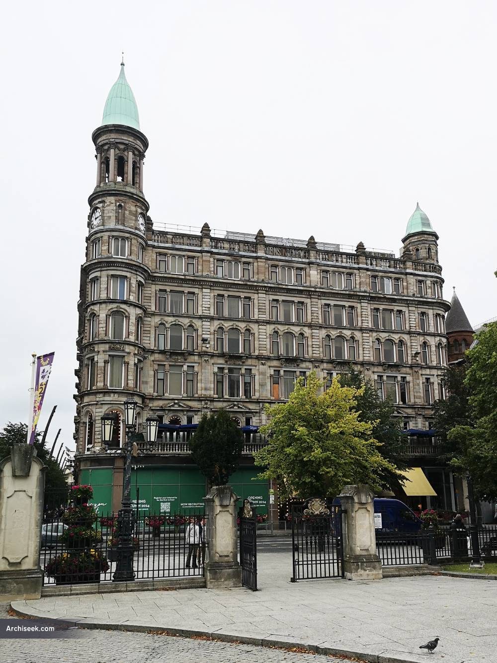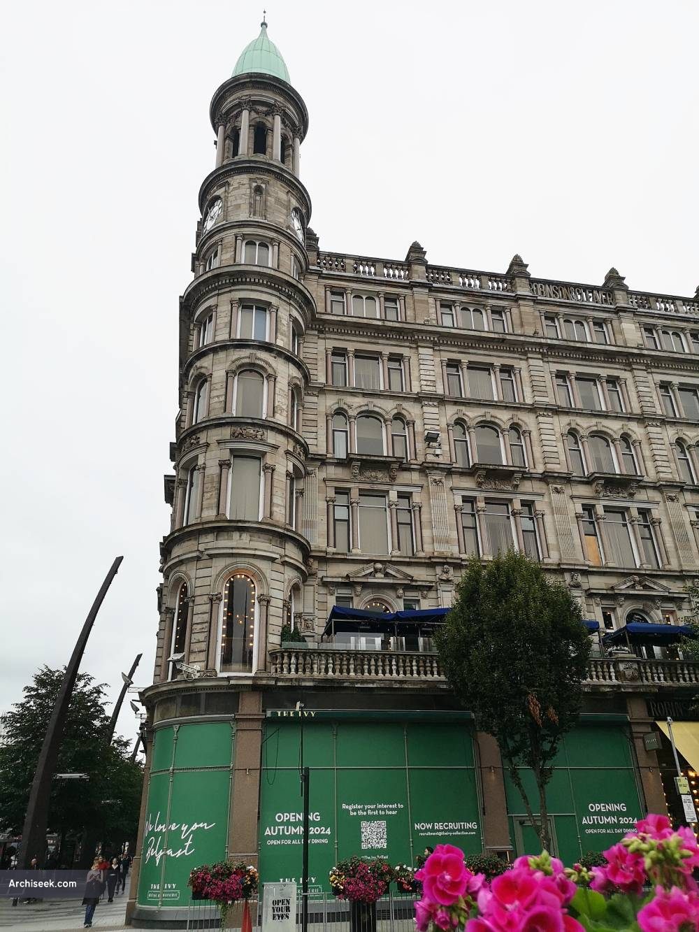 Facing City Hall on Donegall Square North and around into Donegall Place, the former Robinson & Cleaver store is now subdivided up into various commercial premises. Belfast has quite a few former department store premises which have since been subdivided up. The building with its dominant corner position was designed by Young & Mackenzie and built between 1884-85. The exterior is highly decorative with its ogee domes and towers, decorative carvings and rooftop balustrades. Part of the original signage can be seen over the entrance to Burgerking. The interior is much altered, its magnificent marble staircase was removed to Ballyedmond Co. Down.
