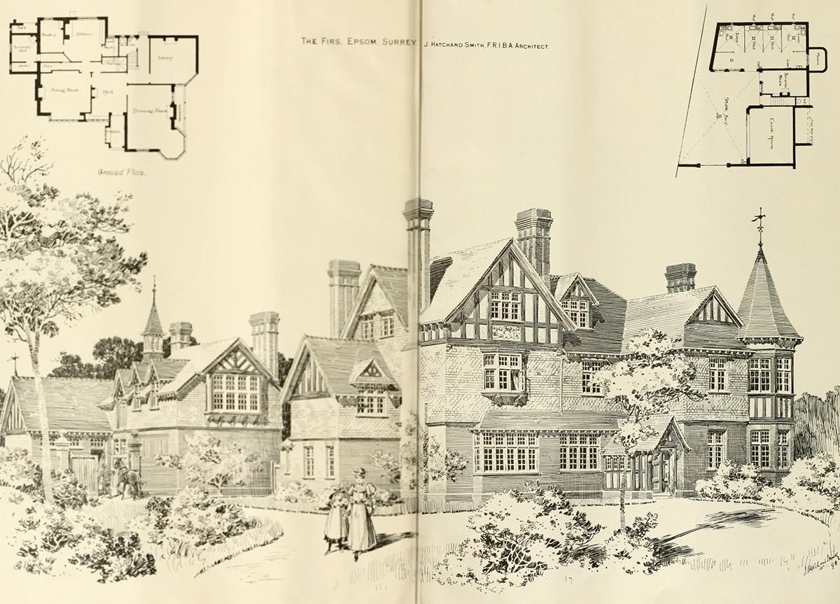 Perspective View including ground plans published in The Building News, December 23rd 1898. “This house occupies an elevated site overlooking the Downs. The walls are faced with local red bricks, the upper part being covered with weather tiling. The roofs are tiled ; the whole of the external woodwork is of oak. The entrance-hall is panelled with Oregon pine. AU other internal joinery is of the same material, stained and beeswaxed. The house was erected by Messrs. J. and H. Ward, from the designs and under the superintendence of Mr. J. Hatchard Smith, F.R.I.B. A. of Moorgate-street, E.G.”