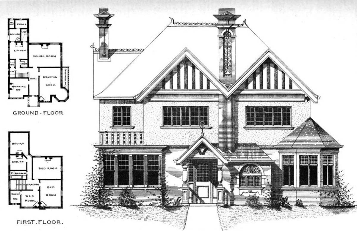 “OUR illustration consists of the front elevation and two plans of above house, about to be erected for M. W. Rowles, Esq. It is proposed to be built of local red bricks-the upper storey to be rough-cast with yellow pebbles ; the gables to be finished in cement, painted a lemon colour ; and the half- timber work painted a red-brown. The roofs will be covered with Brosely tiles . The woodwork in dining-room and staircase to be ash, stained green. The cost will be about £1,200. All the sashes and other external woodwork will be painted white. The hall will be laid with parquetry, and the walls panelled to a height of 6 ft. in ash, stained green. The site is one of the most lovely in the county, commanding extensive and picturesque views. The architect is Mr. W.I. Chambers, of London.”