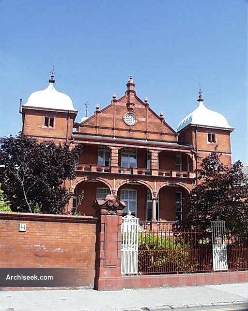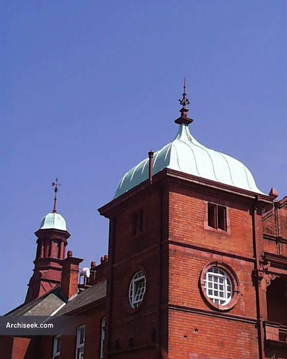 In 1810 a former convent became part of the Grangegorman House of Industry (workhouse) who commissioned a hospital to care for the ‘ruptured poor’. A replacement hospital was constructed 1899-1901 to a design by Carroll & Batchelor in the English Renaissance style in red brick and terracotta tiles – with an elaborate street frontage with corner pavilions. It had estimated cost of £25,000, paid for by the donations of a number of generous benefactors. It was officially opened by Earl Cadogan, Lord Lieutenant of Ireland, in April 1901. After the hospital closed in 1987, it was used as a court building for fifteen years starting around 1996. In 2013 it was acquired by the Irish Nurses and Midwives Organisation who converted it into an education and event centre. Like many buildings around Ireland that were constructed by the Board of Works, there is a myth that the design was intended for a far-flung British colony – usually because of the exotic Victorian design.