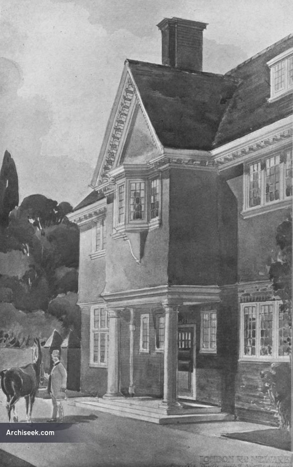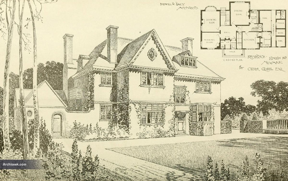 Perspective View including Ground Plan published in The Building News, July 28th 1899. “contains dining-room, drawing-room, morning-room, with sitting entrance-hall, together with the usual kitchen offices and out-buildings ; the exterior being constructed of red sand brick, and the upper portion being of cement rough-cast, the roof being covered with red tiles. The cornice is constructed of wood, and, with the rest of the exterior woodwork, is painted white. The work has been carried out by Mr. William Smith, builder, of Newark, from drawings by Messrs. Brewill and Baily, architects, of Nottingham and Newark.”