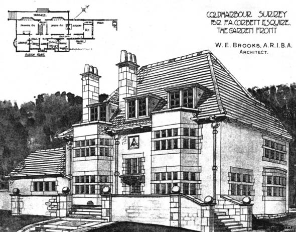 Designed for for F.A. Corbett Esq.. front & rear perspective views including ground plan published in The Building News, July 17th 1903.