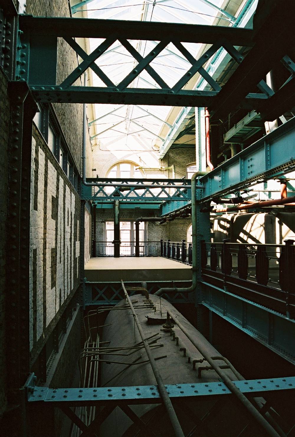 The image to the left shows the Gravity Bar seen from inside the building, while the image to the right shows one of the two original lightwells in the building. The interior of the building was finished in white glazed bricks and these bricks were also used on the undersides of the floors which where constructed on concrete jackarches clad with the bricks.