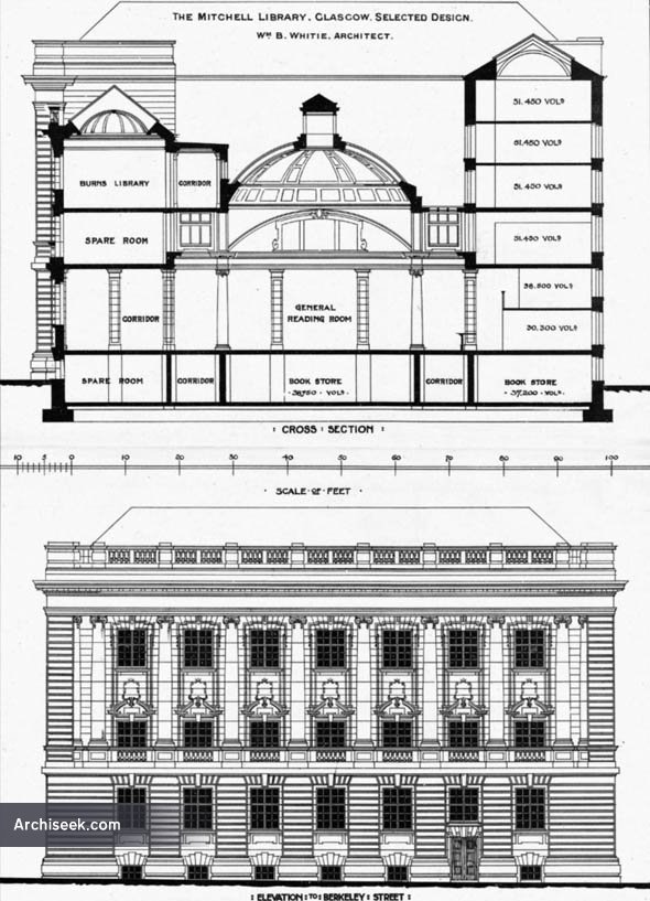 The Mitchell Library was established with a bequest from Stephen Mitchell, a wealthy tobacco manufacturer, whose company, Stephen Mitchell and Son, would become one of the constituent members of the Imperial Tobacco Company. It contains the largest public reference library in Europe, with 1,213,000 volumes. The original North Street building with its distinctive copper dome surmounted a bronze statue by Thomas Clapperton, entitled Literature, often referred to as Minerva, the Roman goddess of wisdom, opened in 1911. The architectural competition for the library’s design took place in 1906 and was won by William. B. Whitie. His original design does not show a dome.