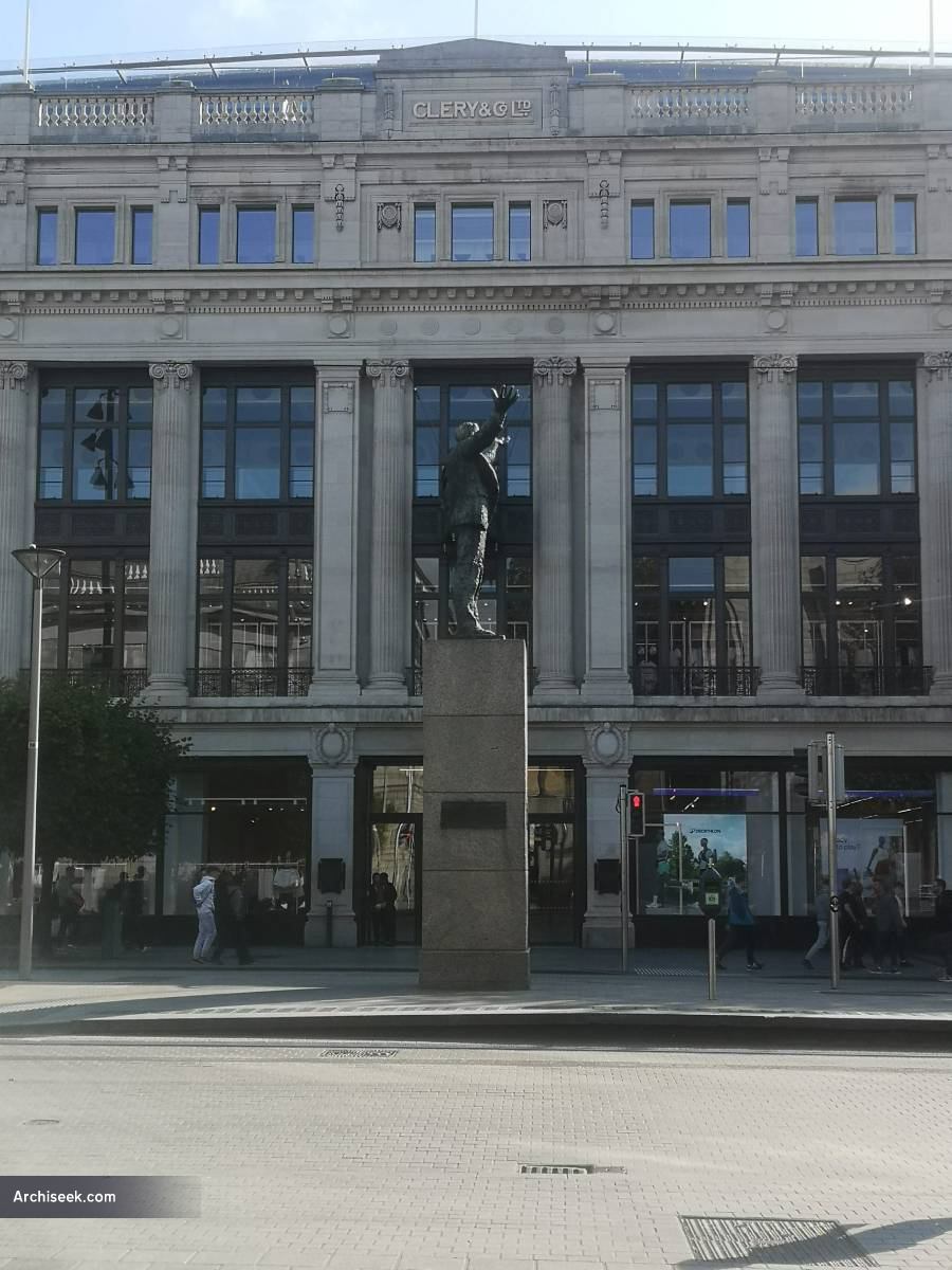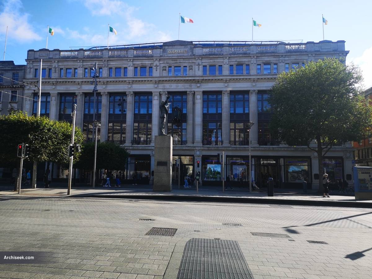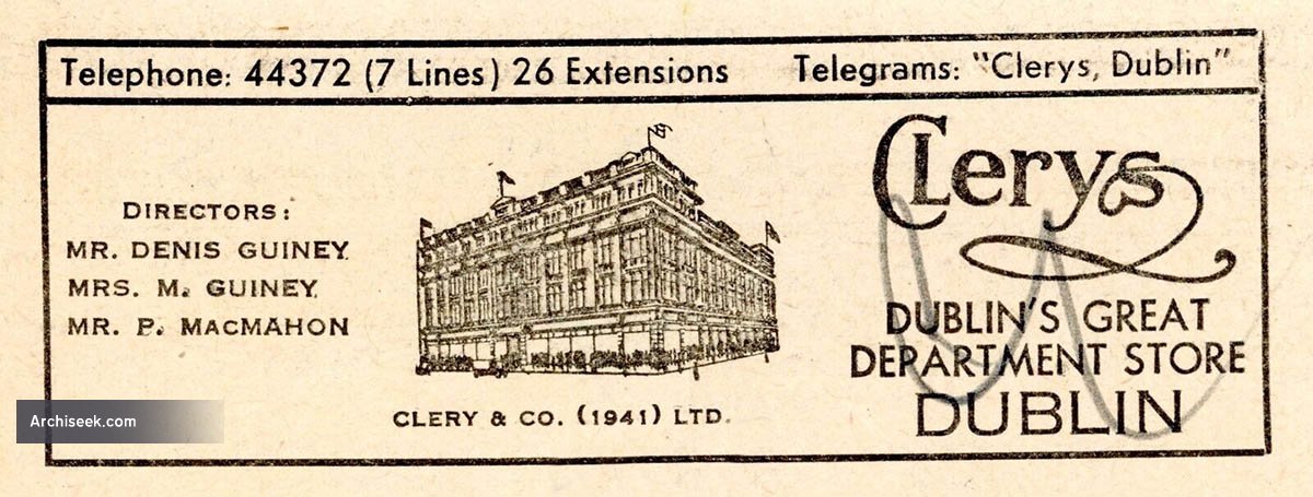 “Further alone on the same side, are Messrs. Clery’s great new premises, which will have a very extensive frontage, and be directly opposite the G.P.O. Messrs. Clery’s premises are still only in skeleton form, being designed on the Hennebique system throughout, and they are to be faced entirely with Portland stone. The building is not yet sufficiently far advanced to judge its architectural qualities, but it should be an imposing structure, owing to its size and scale. The architects are Messrs. Ashlin and Coleman”. The Architect, March 11 1921.