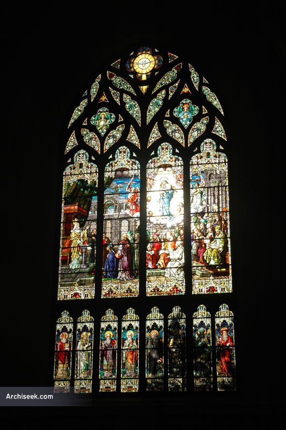 The cathedral’s architect was Leon Coquard of Detroit, who designed the cathedral in a French Gothic style. The architecture share many similarities with the 13th century Saint Nicholas Collegiate church from Munster, Moselle in France. The Bishop Nicholas C. Matz who supervised construction was born in this village, so it is perhaps not coincidental. The twin 210 foot spires were capped in 1911. The exterior of the structure is made up of limestone from Indiana and granite from Gunnison, Colorado. The altar, statuary, and bishop’s chair are all made of marble imported from Carrara, Italy.The seventy-five stained glass windows came from the F.X. Zetter’s Royal Bavarian Institute of Munich. With the structure virtually complete, a bolt of lightning struck the west tower on August 7, 1912 and knocked off the top twenty five feet. The spire was repaired before the dedication. The total cost to build the Cathedral was approximately $500,000. The Cathedral was consecrated in 1921. On June 23, 1997, the east spire of the Cathedral was struck by lightning. Repairs took nine months to complete.