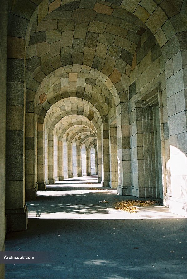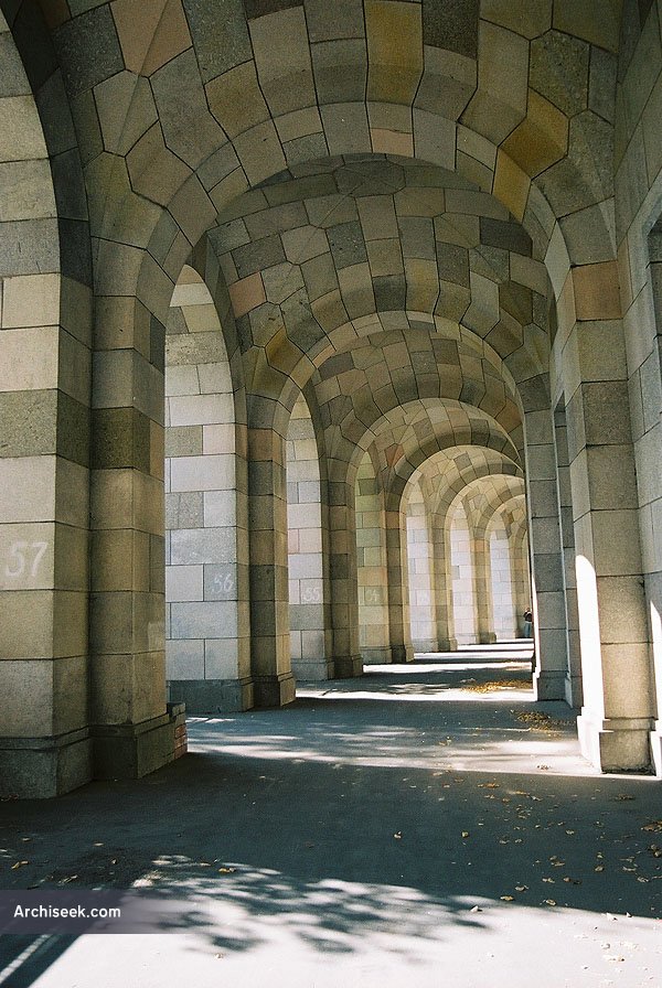 Hitler conferred upon Nuremberg the title, “City of the Party Rallies” for mainly pragmatic reasons. Up to one million Party members would travel to Nuremberg for the week-long rallies, completely swamping the city, and the city, situated in the centre of Germany was easily accessible. Hitler also wanted to appropriate the city’s history for the glorification of the Nazi party. A large auditorium was needed for this once-a-year event and so Hitler commissioned the Congress Hall. The Hall was designed to hold over 50,000 people but was never finished. The horseshoe-shaped building covers a total area of about 300 x 300 metres. The scale of this structure is overwhelming with an immense arcade running around the lower level of the u-shaped structure. The arcade only serves to dwarf the visitor and make them feel more insignificant in the face of the Nazi system. The monumentality of the building is increased by the simplicity of the over-sized architectural detailing. The facade of the Congress Hall is made of granite slabs, to make it appear as monumental as possible. The body of the building, which in its final form would have completely concealed, consists of brick and reinforced concrete and this can be seen in the courtyard.