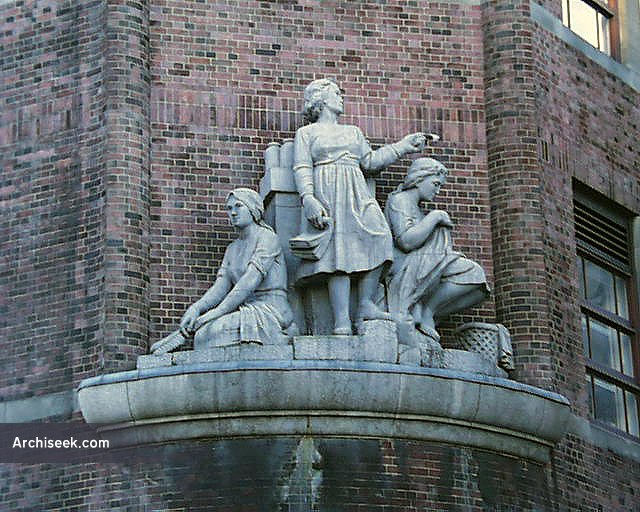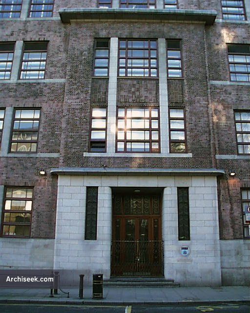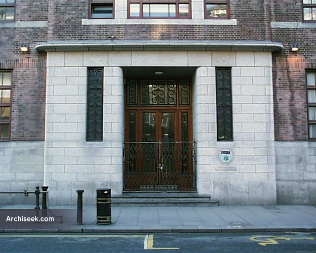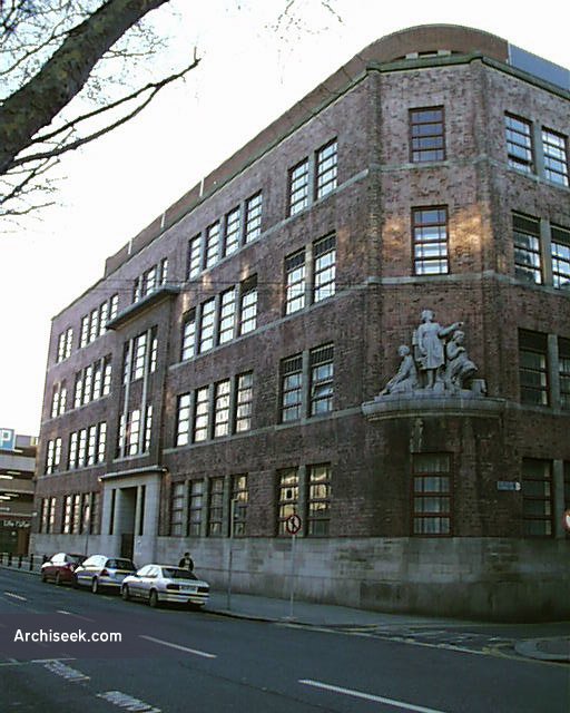 Built as the College of Domestic Economy for the City of Dublin Vocational Education Committee and later a part of DIT. It has an excellent Art Deco entrance hallway. The external bulk is softened by the angled brick corners. The corner closest to O’Connell Street, the eastern, has a large relief sculpture set above street level. A similar spot at the western end is empty.