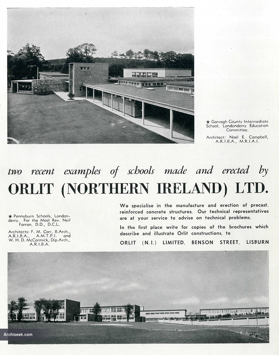 The classrooms are generally lighted by windows on two sides, as well as clerestory windows over. These classrooms were given an ‘informal character’ by the provision of chalk boards on the long wall, omitting division walls between classrooms and stores and architect-designed built-in furniture constructed of wood and plastic veneer. The tank tower next to the entrance was embellished with a county crest modelled and coloured by the architect himself. The school closed on 31 August 2013 due to a steady decline in numbers attending. The main building retains listed status as one of Northern Ireland’s finest examples of 1950s school architecture.