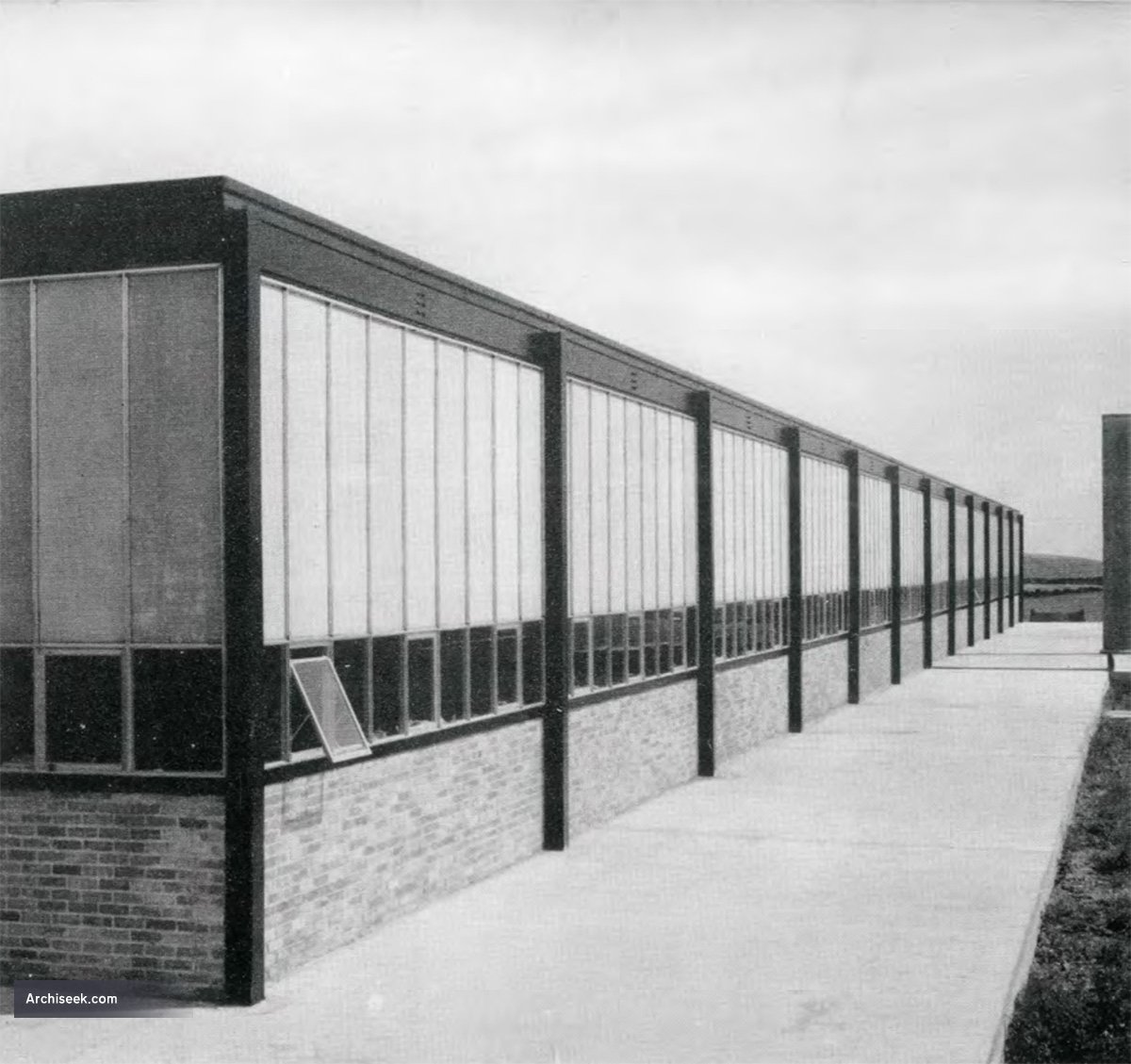 Kire Manufacturing was an american company who were manufacturers of ladies’ garments mainly for export. Its main factory was here in Kinsale and it had branch factories at Fermoy, Bandon, and Newmarket. It was the first steel exposed structure in Ireland at the time of completion, and one of the first State-supported industrial projects as envisioned in the First Programme for Economic Expansion (1959-64). Miesian in design, the main entrance was marked by a wide flight of stairs suggestive of that at the then recently completed Crown Hall at the IIT in Chicago by Mies. Closed in 1974.