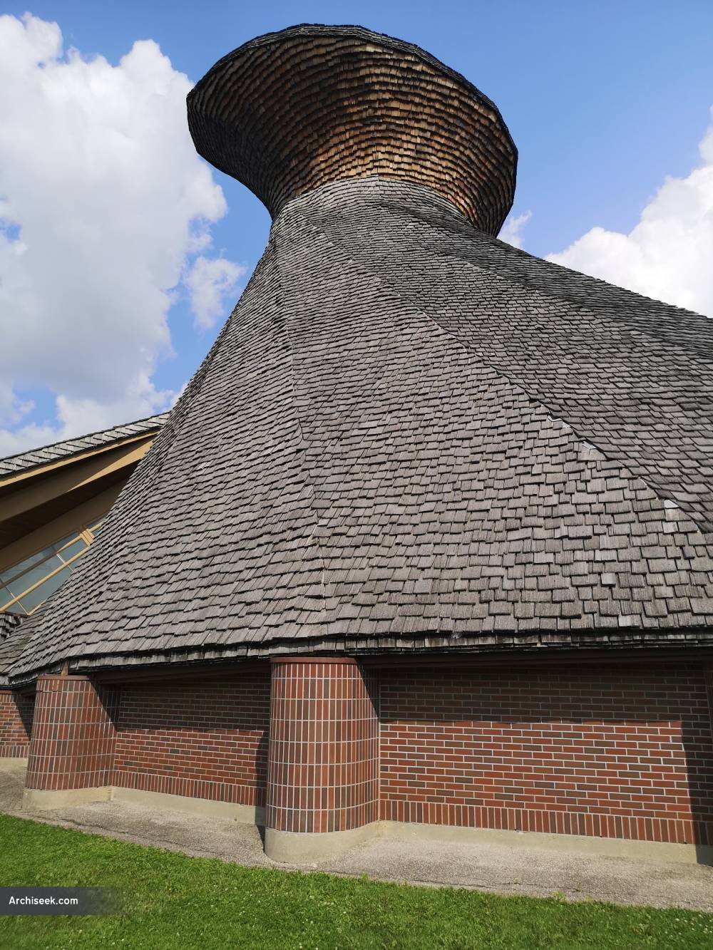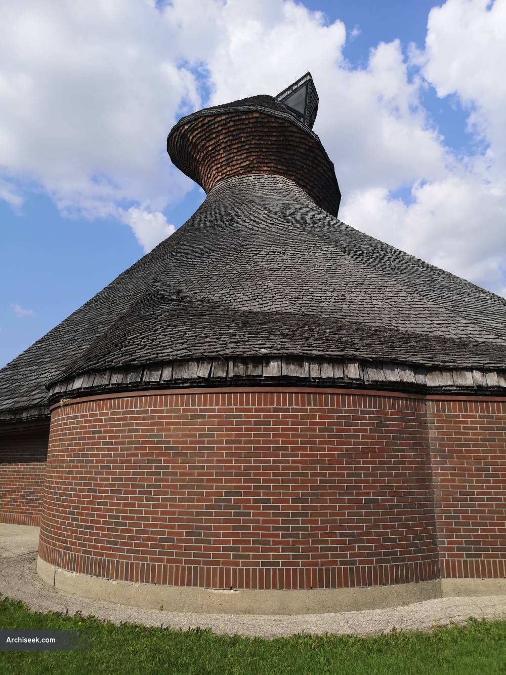 From this, Gaboury evolved his design towards a spiral structure, progressing from a clockwise plan which encouraged the free movement of the congregation while emphasising the hierarchy of liturgical function. As the church was intended to house a largely Metis congregation, Gaboury took his inspiration from “a non-Christian but Prairie idiom – the native Indian tepee.”