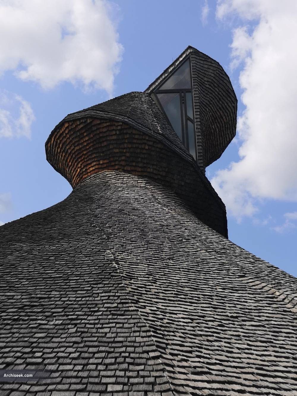 The interior of the church features a nave proper of approximately eighty-eight feet in diameter, with a full width of 145 feet. Twenty-five laminated wooden beams, from seventy-two to a hundred feet long, swirl upwards to a height of eighty-five feet to support the roof which is comprised of stained cedar deck on the interior and rough cedar shingles on the exterior The rising beams climax in the natural formation of the open skylight, an echo of the tepee’s smoke-hole, which introduces light as the central focus of the structure.