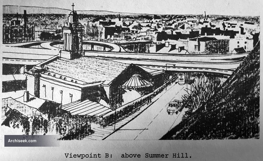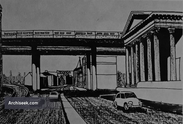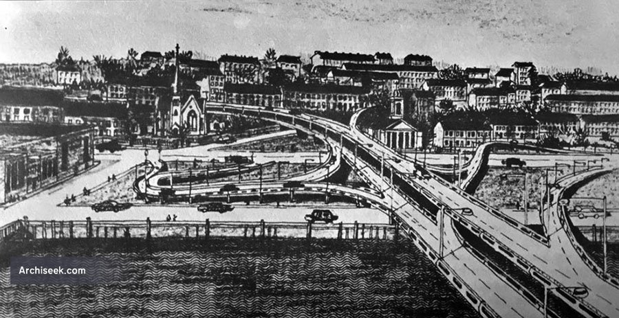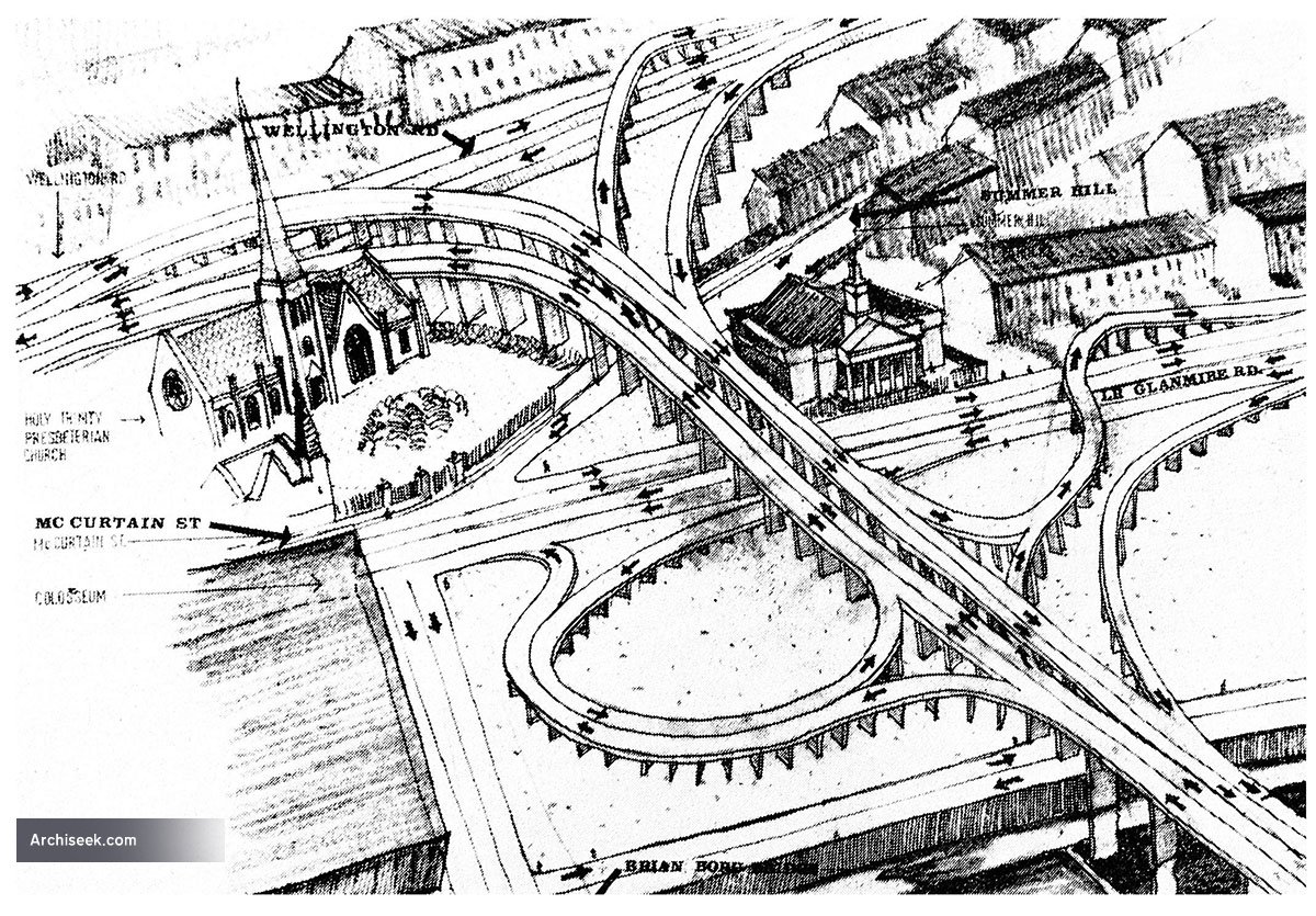 In July, 1963, City Corporation advertised for a traffic consultant to survey and present plans for parking, road improvements and traffic control measures to solve the chronic traffic congestion in the city. They appointed Patrick F. McCarthy, of B.K.S Consultative Technical Services, from Dublin. In early 1968, he suggested this plan with large areas being cleared. It also envisaged new bridges and overpasses, widened arterial and city centre routes – very similar to the later 1973 Central Dublin Traffic Plan. The planned completion date was 1986. There was fairly strong opposition to the plan from the public, but was strongly backed by the city councillors, but ultimately it was killed off by the 1970’s Irish economy and its enormous cost.