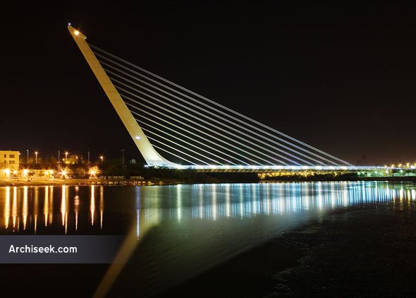 The Alamillo Bridge spans the Canal de Alfonso XIII in Seville, allowing access to La Cartuja, an island between the canal and the Guadalquivir River. The bridge was constructed as part of infrastructure improvements for Expo 92, which was held on a large site on the island. Construction of the bridge began in 1989 and was completed in 1992.