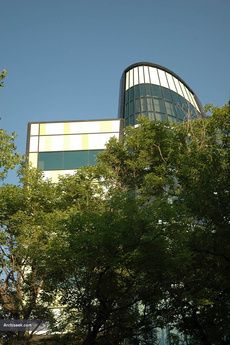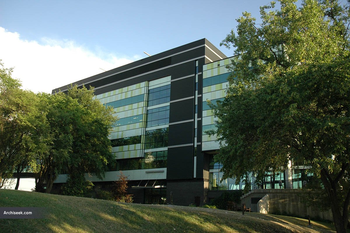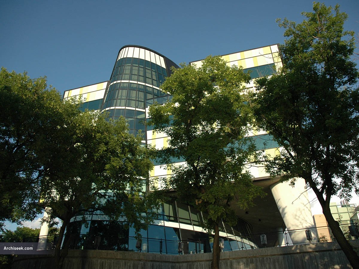 Very striking building on the hospital campus, facing across the river to downtown Winnipeg. Clad with coloured glass panels and with a conical glass feature, the building sits on a rough concrete plinth providing an interesting contrast in materials and finishes.