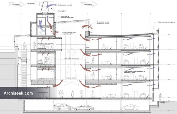 The form of the building and the internal spaces are the product of a holistic environmental strategy, which integrates the latest technology to create a good working environment. The office floor plates are typically naturally ventilated. The Civic Hall acts as a return plenum for adjacent offices while fresh air, collected at roof level using rotating wind cowls, is supplied via large ‘chimneys’ in the roof and walls of the Civic Hall through the floor plenum to the offices.