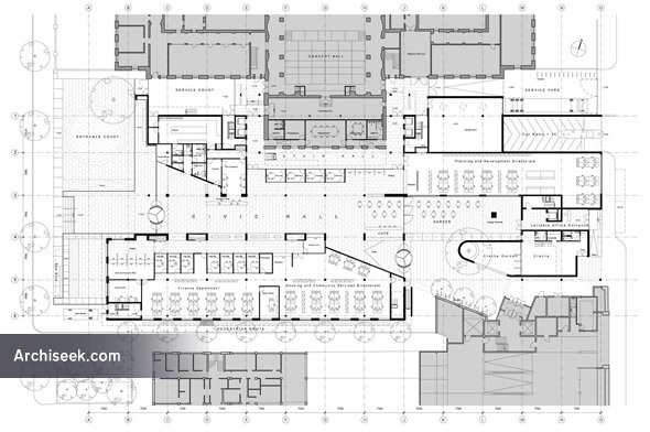 The Civic Hall, conceived as a new heart to the City Hall, engages in an existing diagonal public route across the site, forming a new covered street for the city. The space is of a scale and dimension equivalent to that of the existing Concert Hall. Approached via a gently inclined forecourt, the stone-paved Civic Hall extends the city pavements for the citizens of Cork, allowing this administrative centre to become an event within urban fabric, a place for the citizens to conduct business and to witness the process of local government in action. The space also serves as a ‘grand foyer’ to the concert hall. Here, the public can gather during intervals in performances, receptions can be held, and exhibitions displayed.